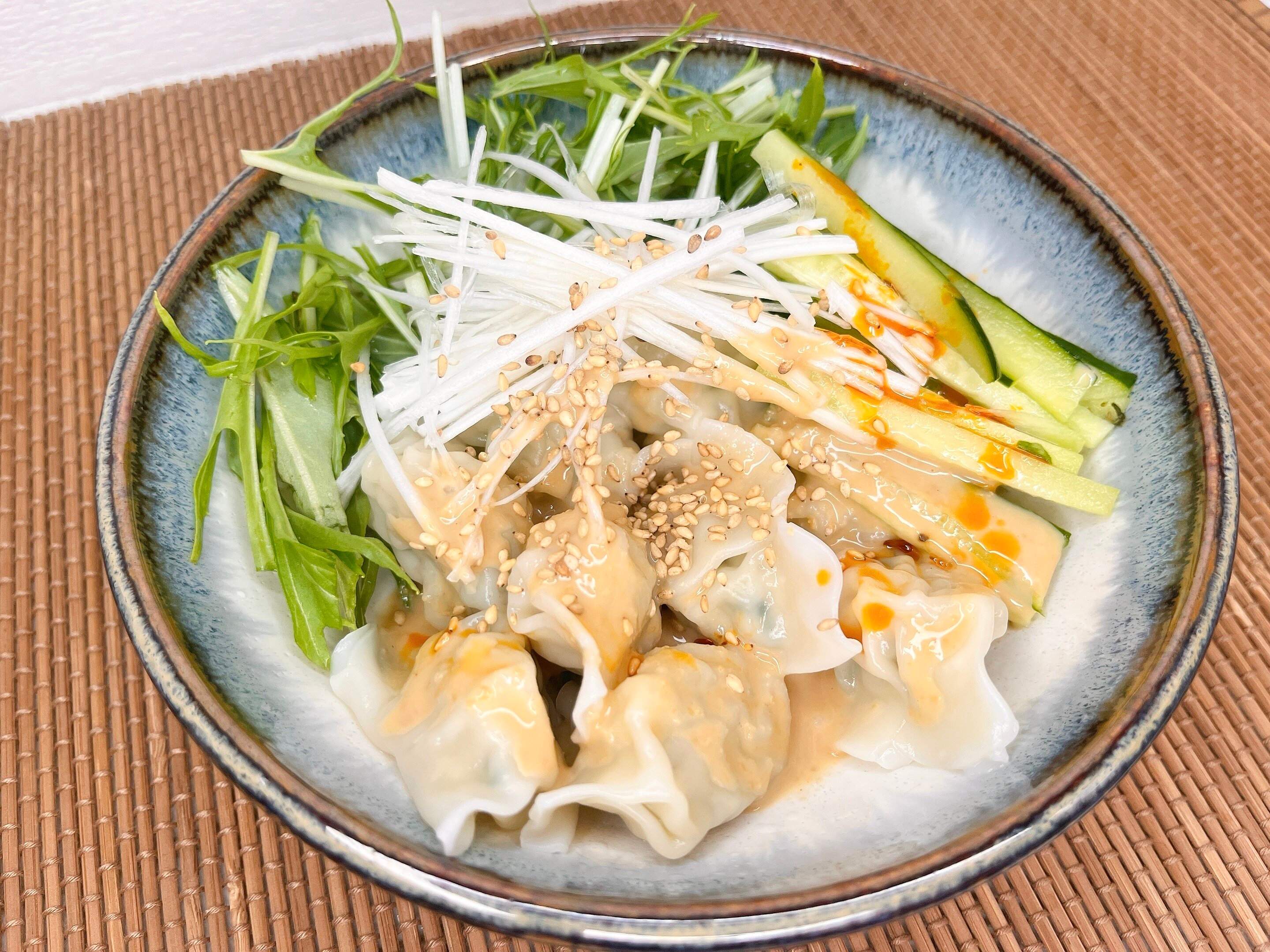 茹でた水餃子を冷水でしめて、細切りきゅうりやレタスなど生野菜の上にトッピングします。