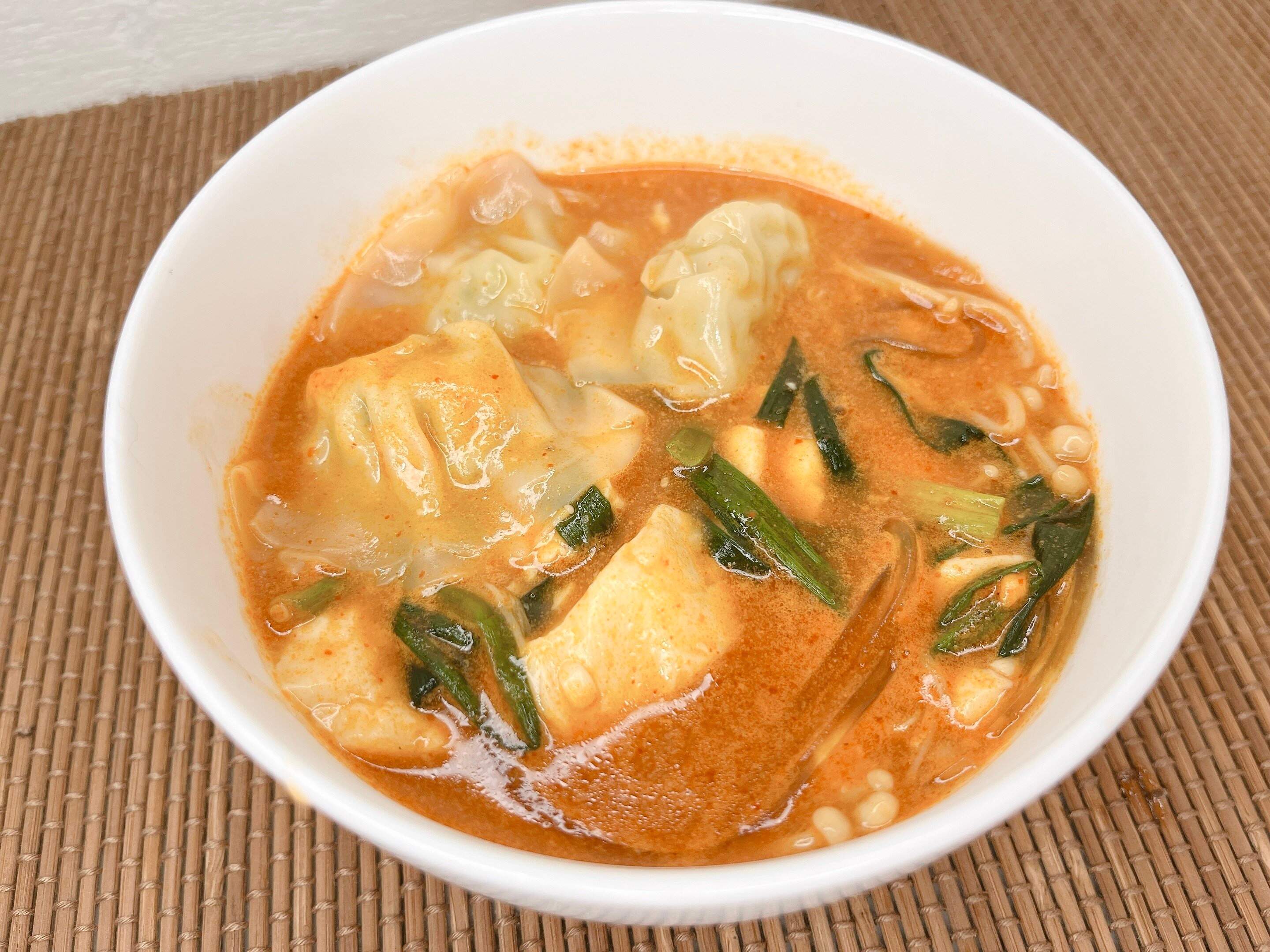 麺を茹でて普通にラーメンを調理し、最後に茹でた水餃子をワンタン麺風に盛り付けたら出来上がりです。