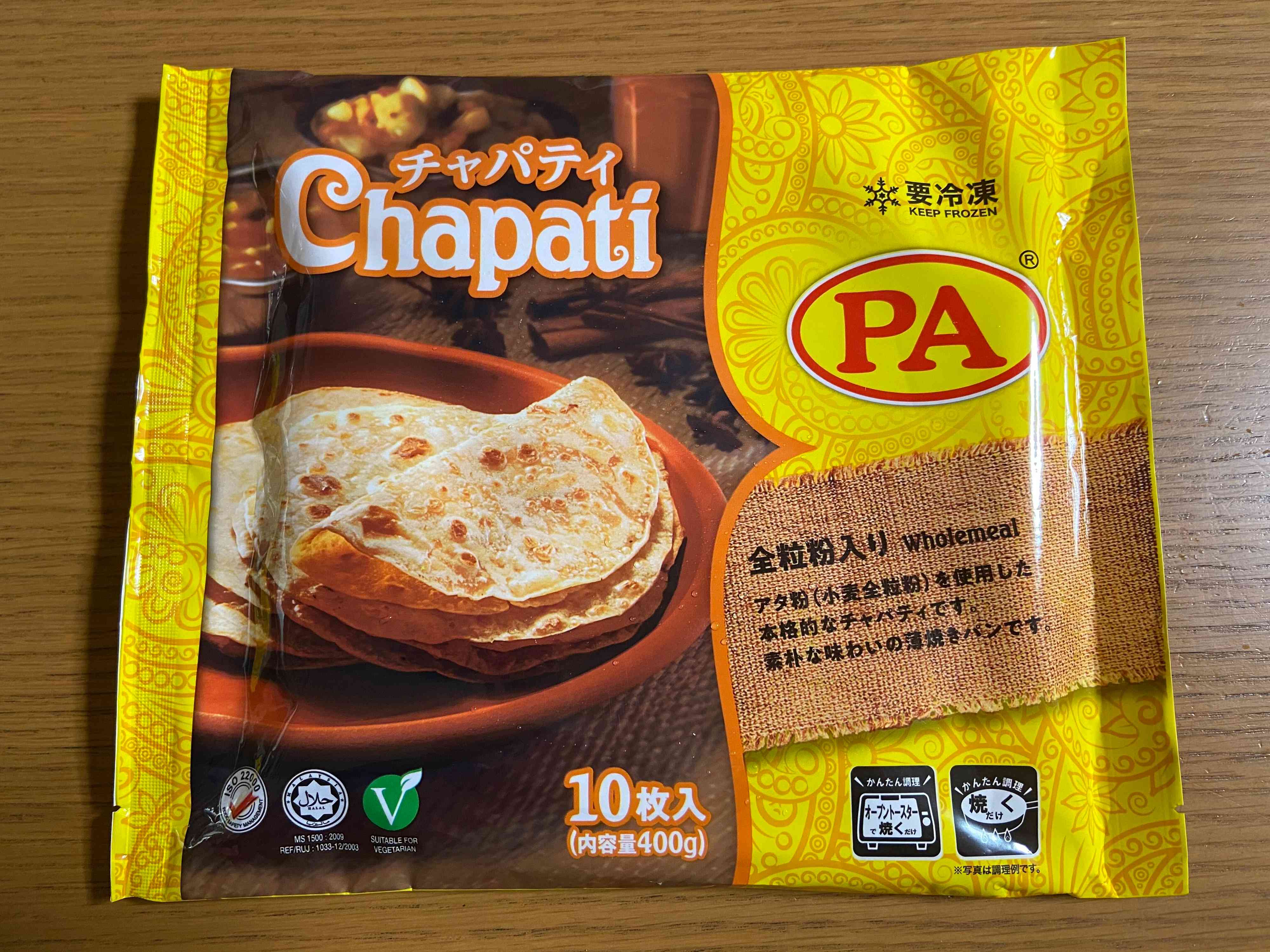 チャパティとはなかなかなじみのない商品ですが、インドやマレーシアでよく食べられる全粒粉入りの素朴な薄焼きパンとのこと。
