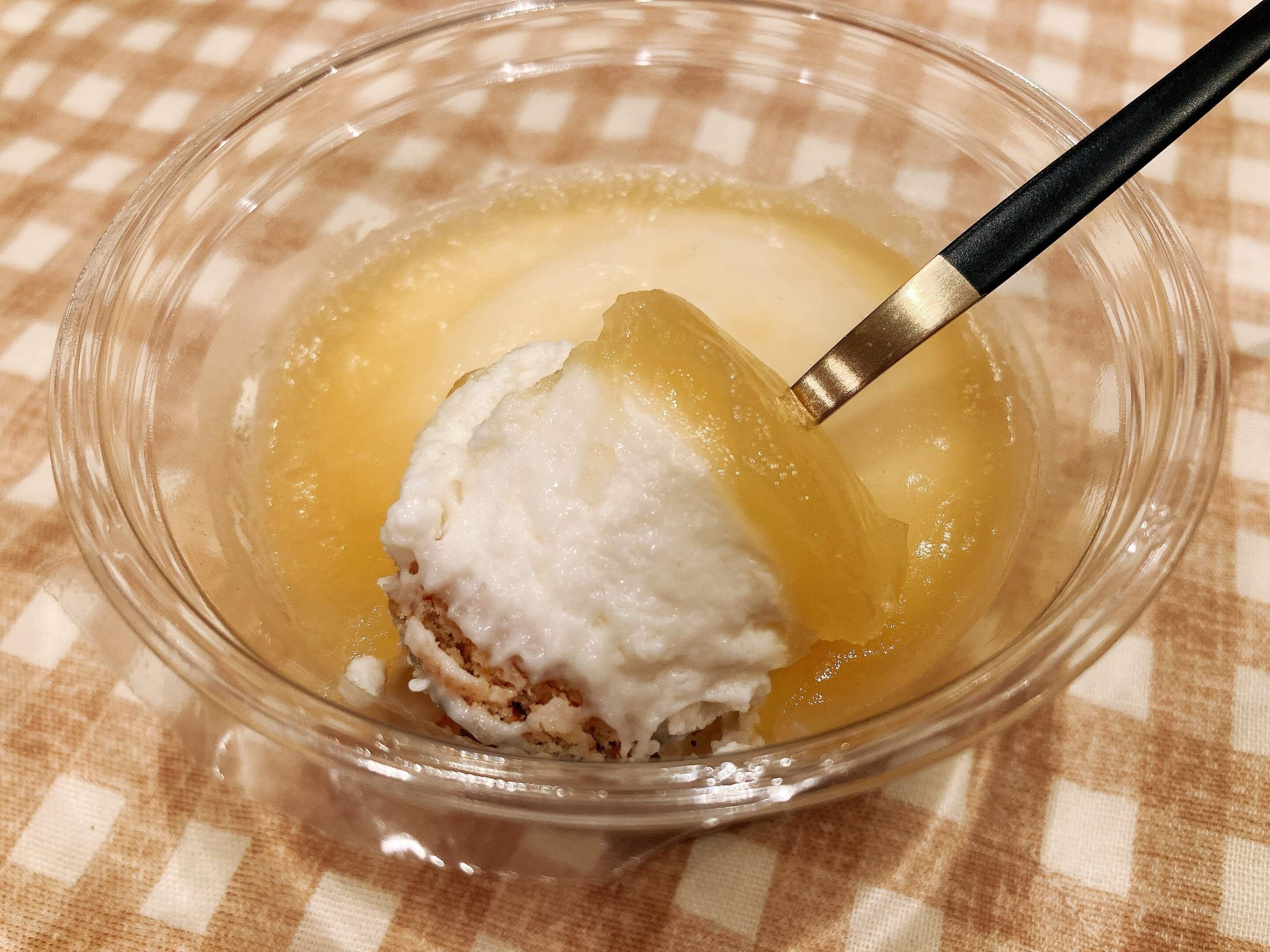 チーズケーキの水分を吸ってしなしなになっているかと思いきや、ビスケットのさくさく食感が残っていて、しっかりビスケットの食感を感じられます。