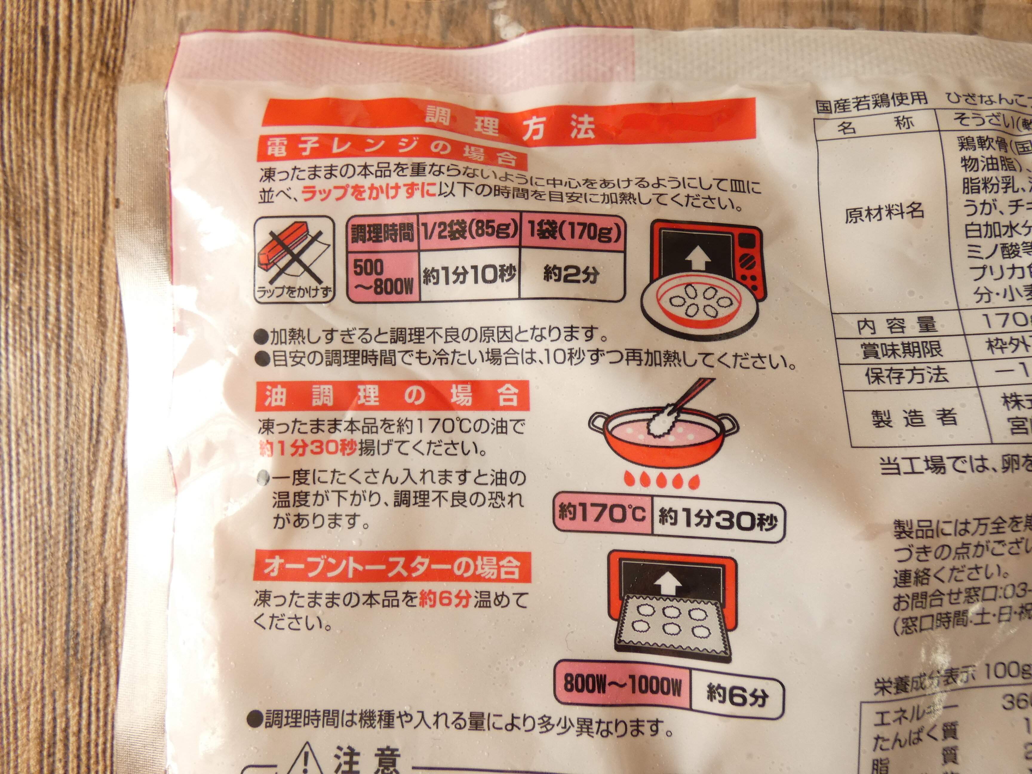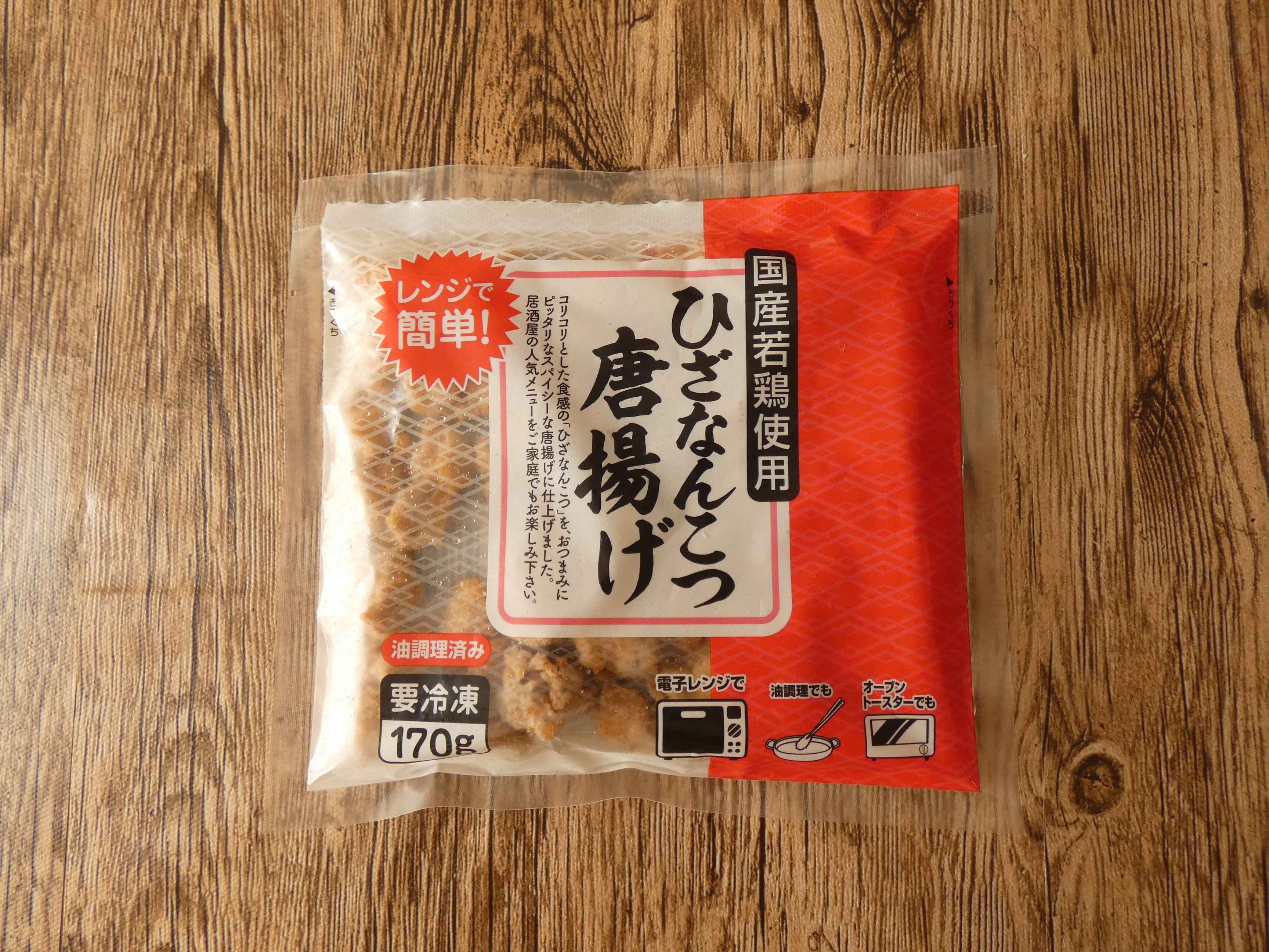 業務スーパー「ひざなんこつ唐揚げ」は170g300円。調理ずみの冷凍食品で、このお値段でおうち飲みが楽しめるのでコスパ抜群です。