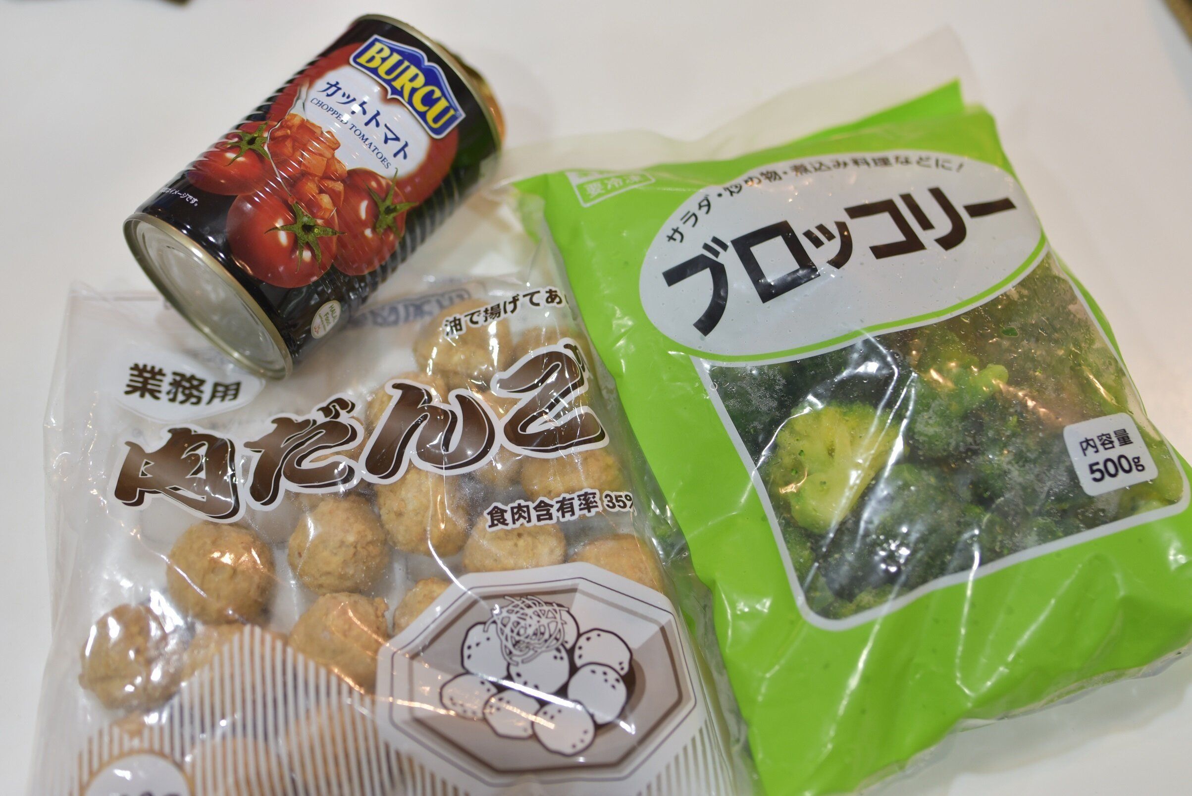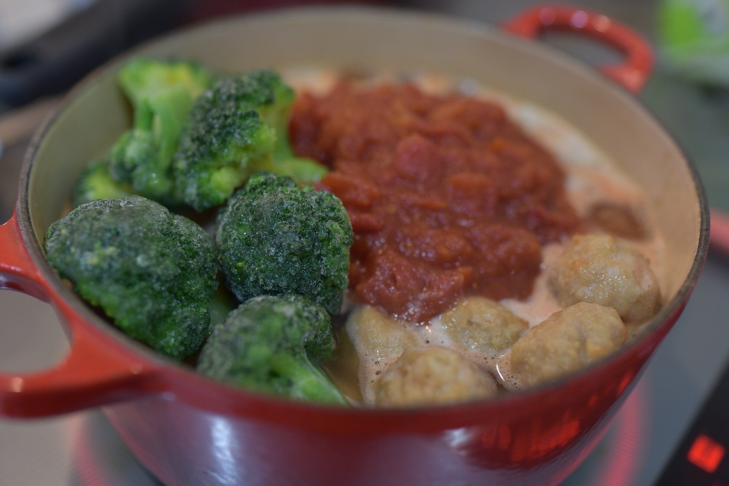 玉ねぎ、にんじん、じゃがいもがやわらかくなったところに、トマト缶と肉だんご、冷凍ブロッコリーを入れて煮込みました。