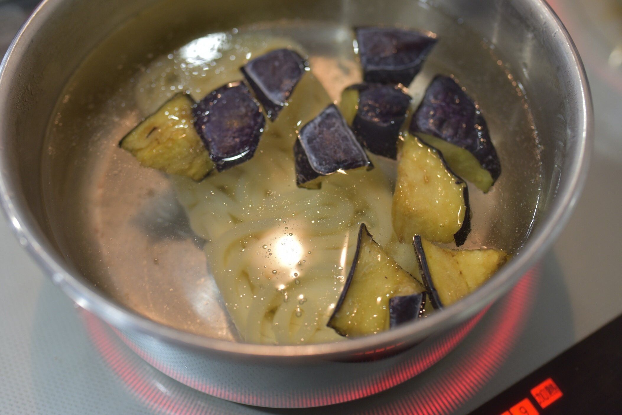 沸騰したお湯にうどんとナスを入れます。うどんは2~3分ほど加熱。なすは解凍されて柔らかくなれば大丈夫です。
