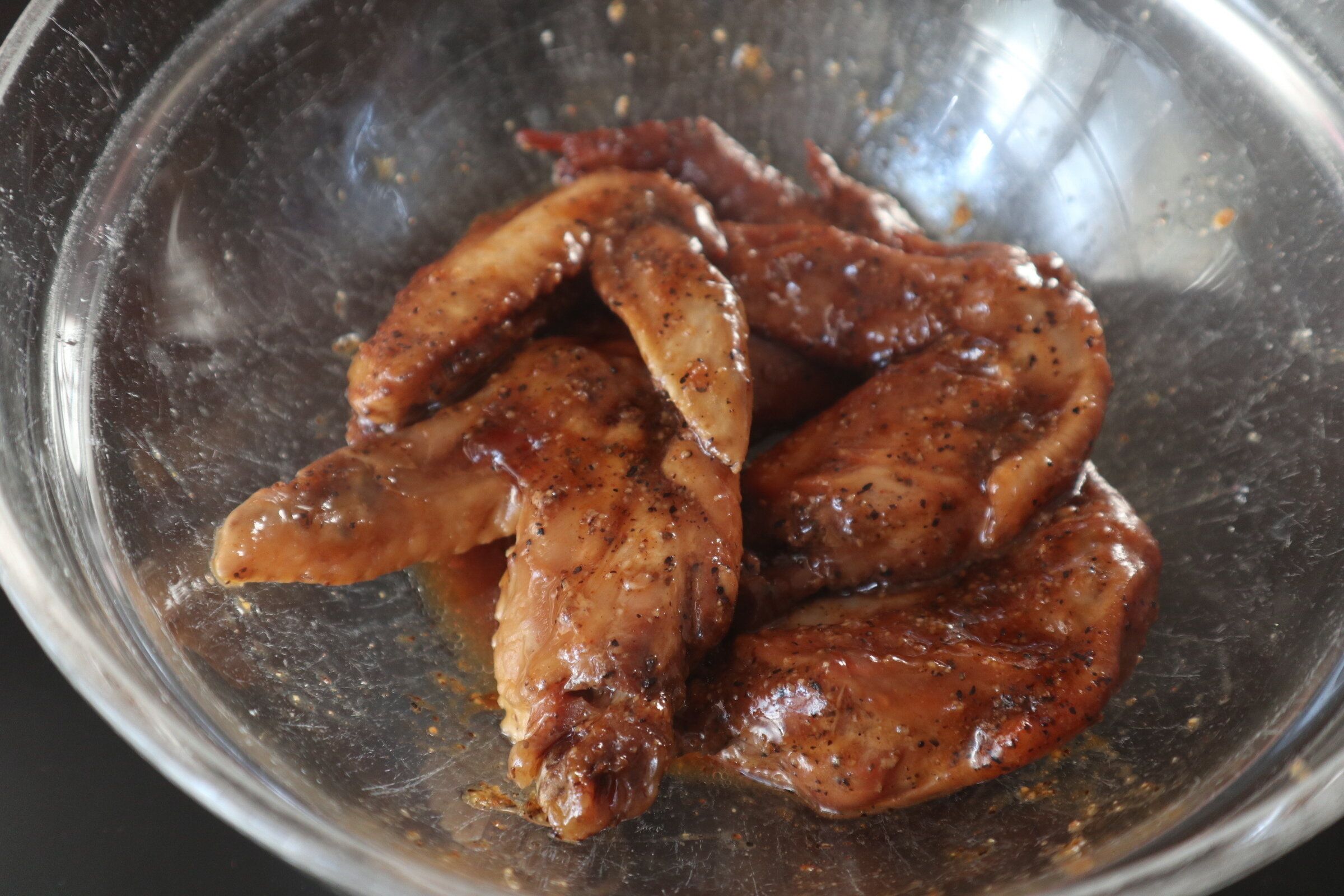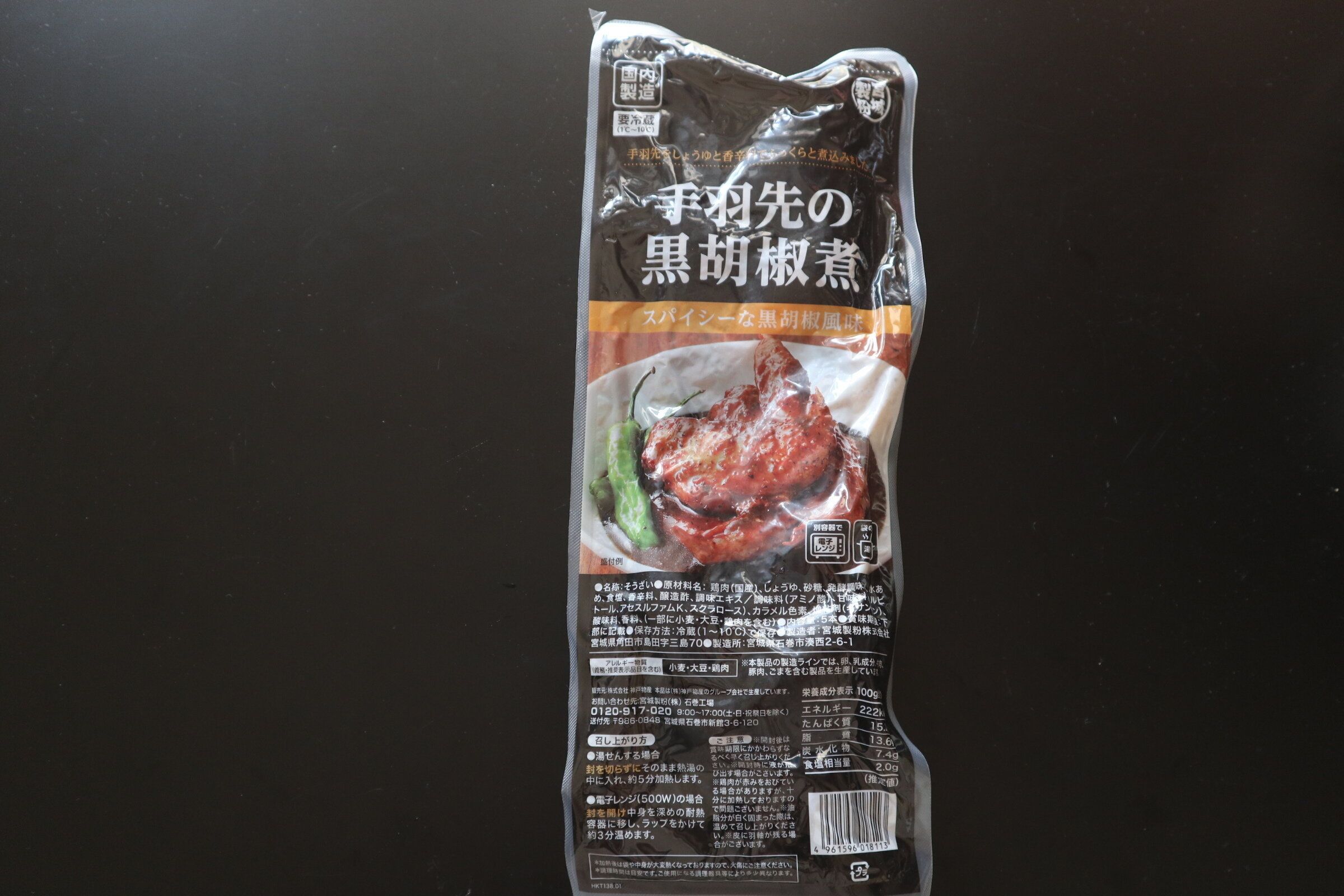 手羽先が5本入っています。とろみのある黒胡椒ソースがからんでいます。調理方法は、湯煎もできますが、耐熱皿に移してフワッとラップをかけて600Wで3分加熱したら完成です。とても手軽。