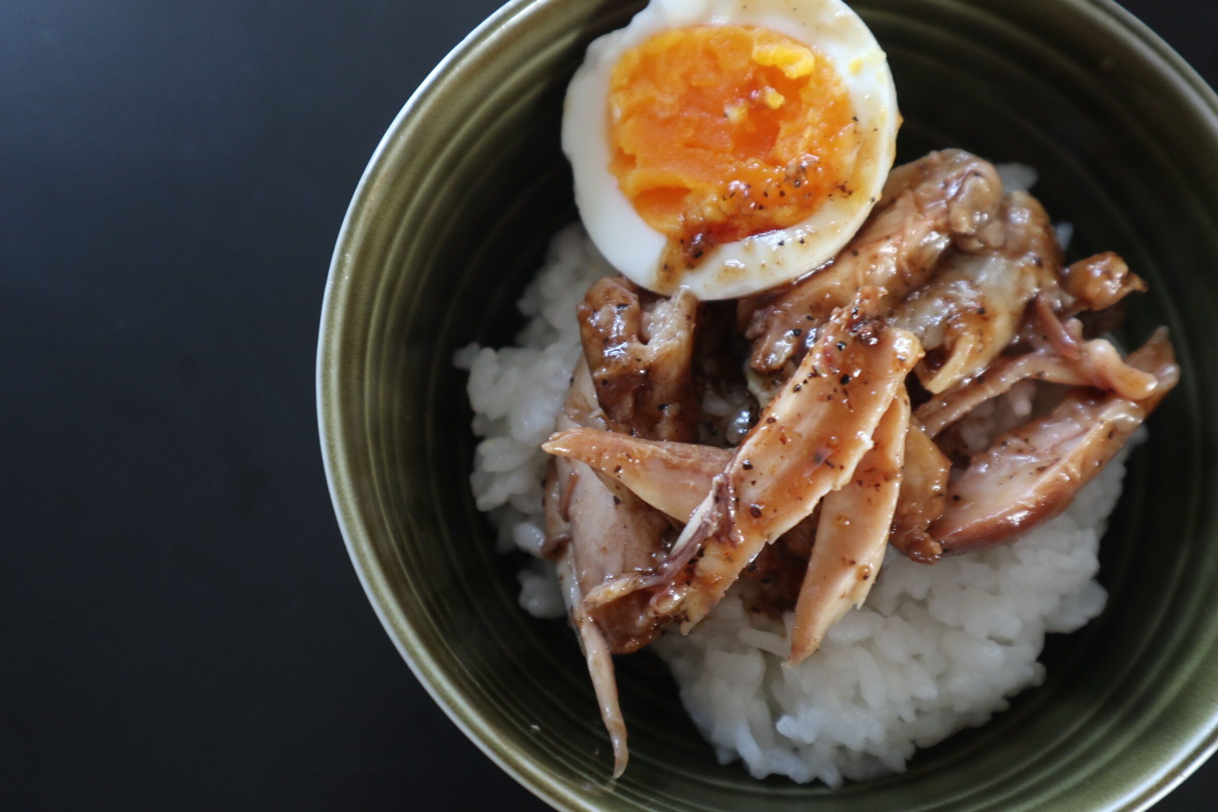 ご飯にほぐしたお肉と卵をのせたら、簡単丼の完成です。ご飯が進む味で満足感たっぷりです。