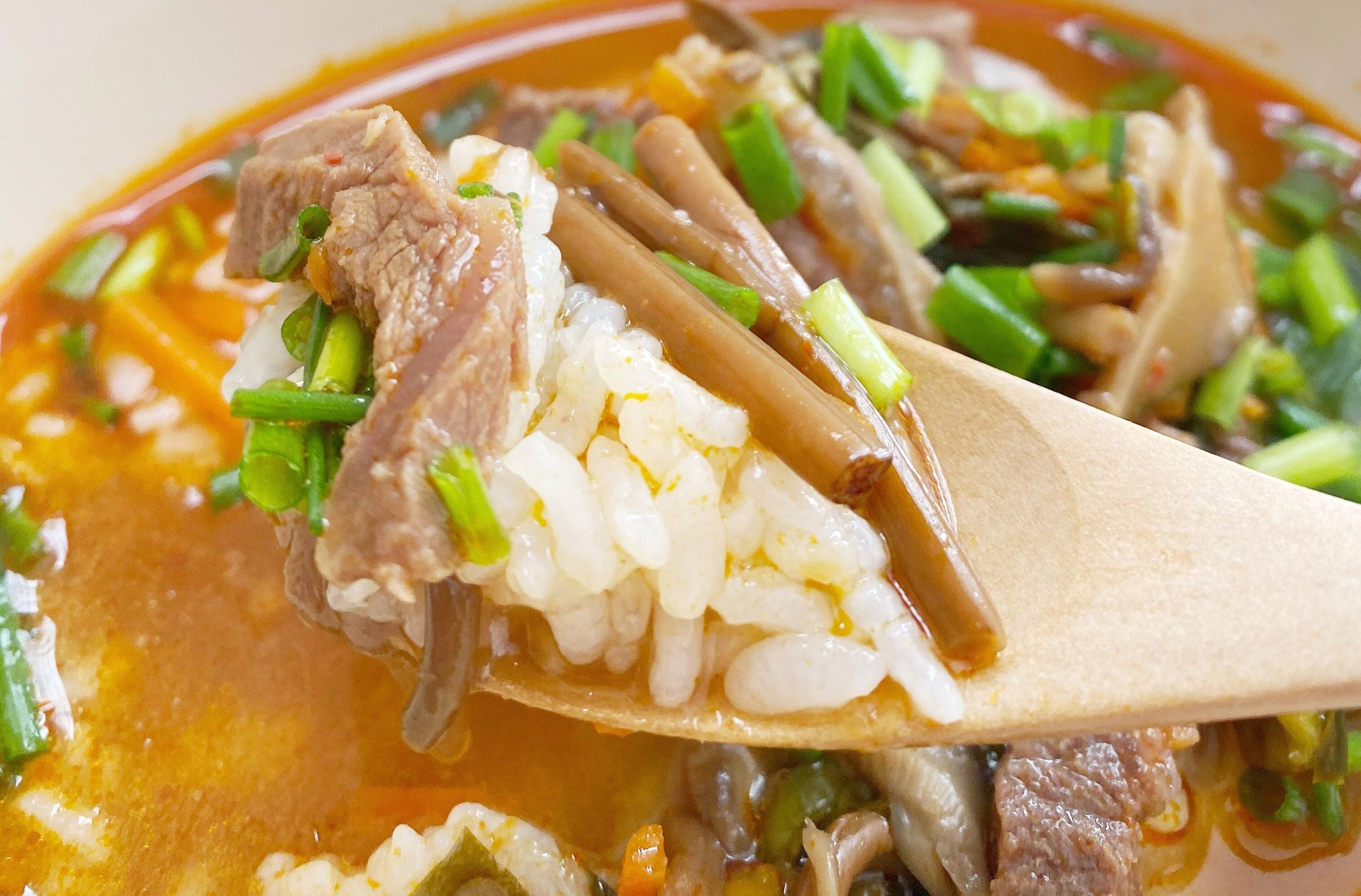 ラージャン、豆板醤を加えた少し辛めの牛だしスープに、牛肉、椎茸、ぜんまい、豆もやしなど、たくさんの具材が入っています。