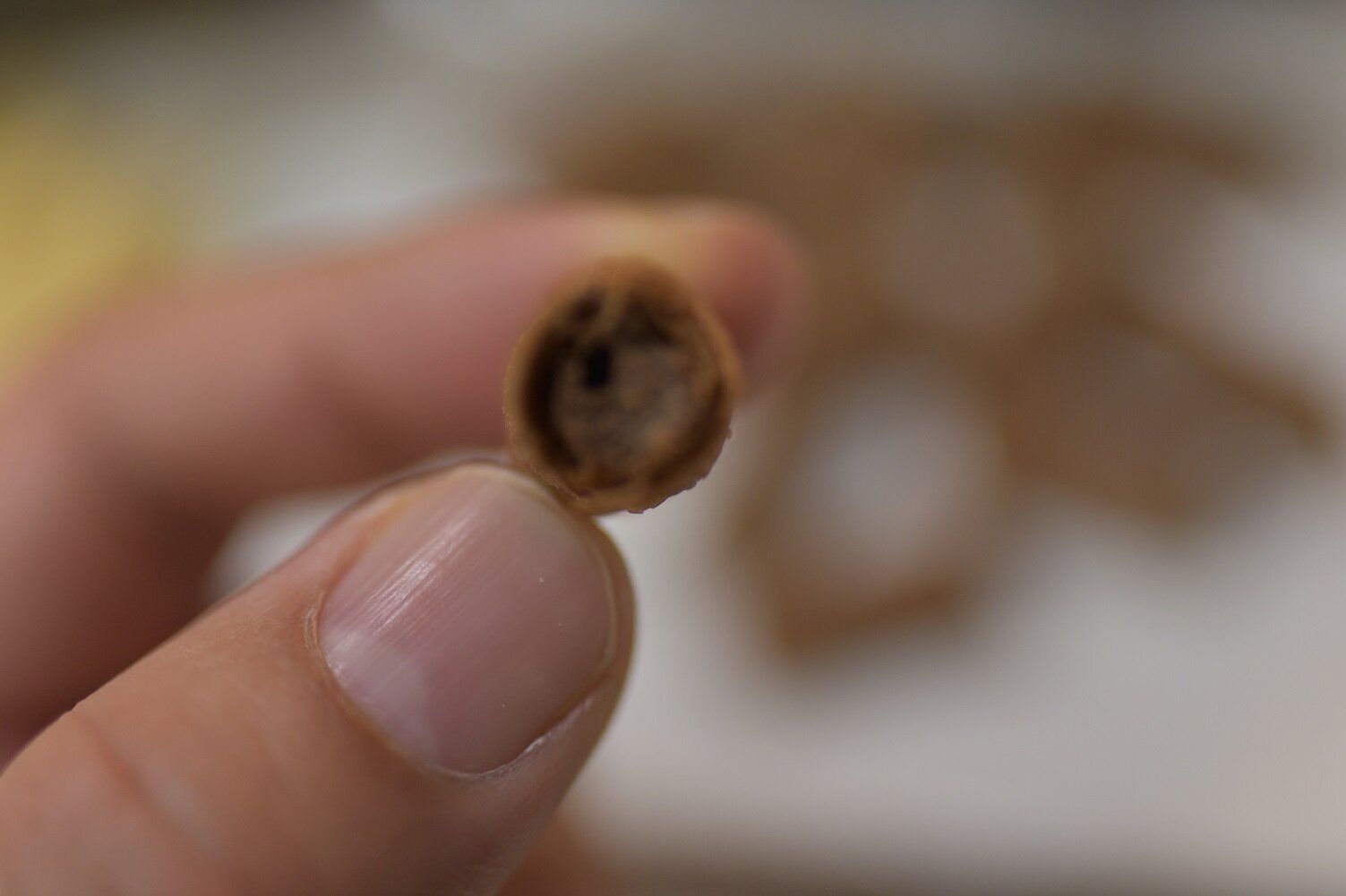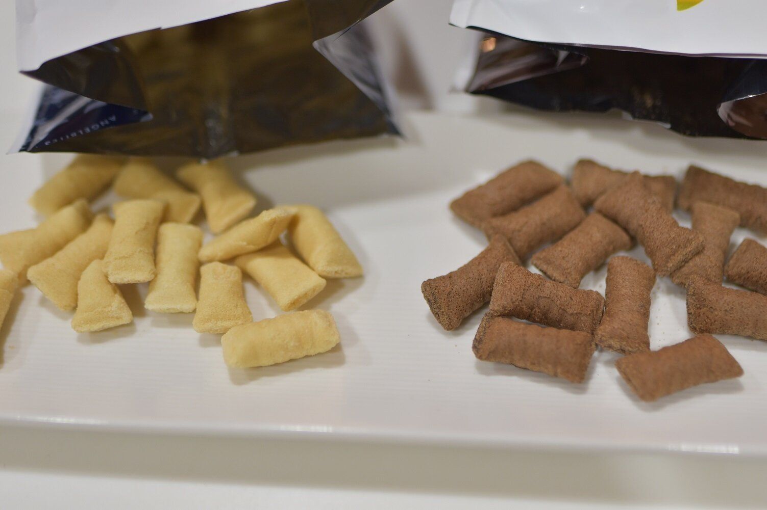 1cm×2cmほどの小さなサイズのお菓子が、袋にたっぷりと入っています。バニラ味はバニラクリームを、チョコ味はココアクリームをウエハース生地に合わせたお菓子です。
