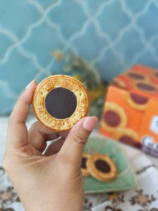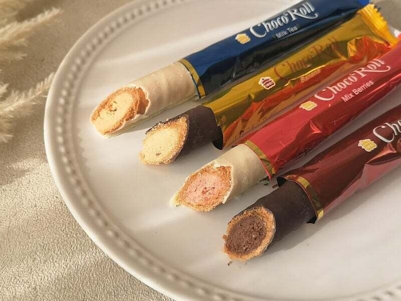 サクサクのクッキー生地で甘いクリームを包み込み、チョコレートでコーティングされたお菓子で、ミックスベリー、ヘーゼルナッツ、バナナ、ミルクティーの味が楽しめます。