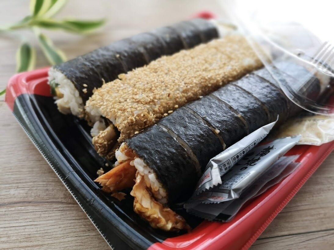 穴子ロール(酢飯、煮穴子、玉子焼、きゅうり、たれ、ごま、海苔)