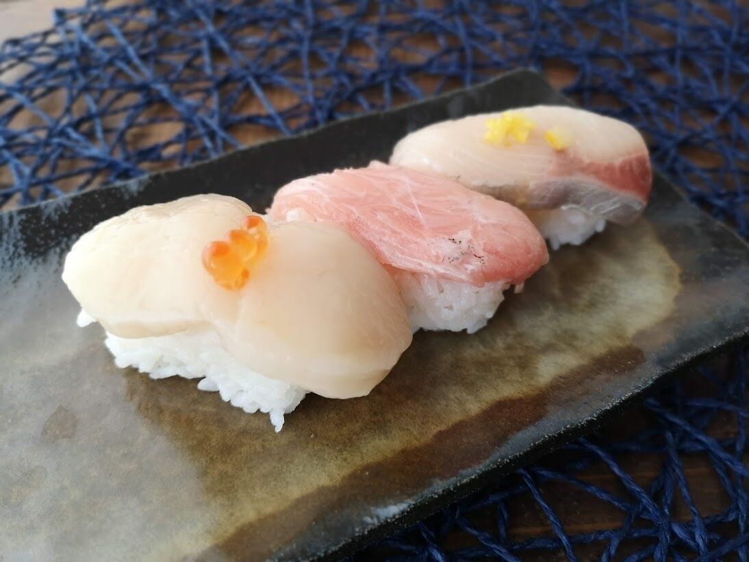 ホタテ、トロ、ぶりの3ネタが6貫ずつ合計18貫詰められたにぎり寿司セットです。