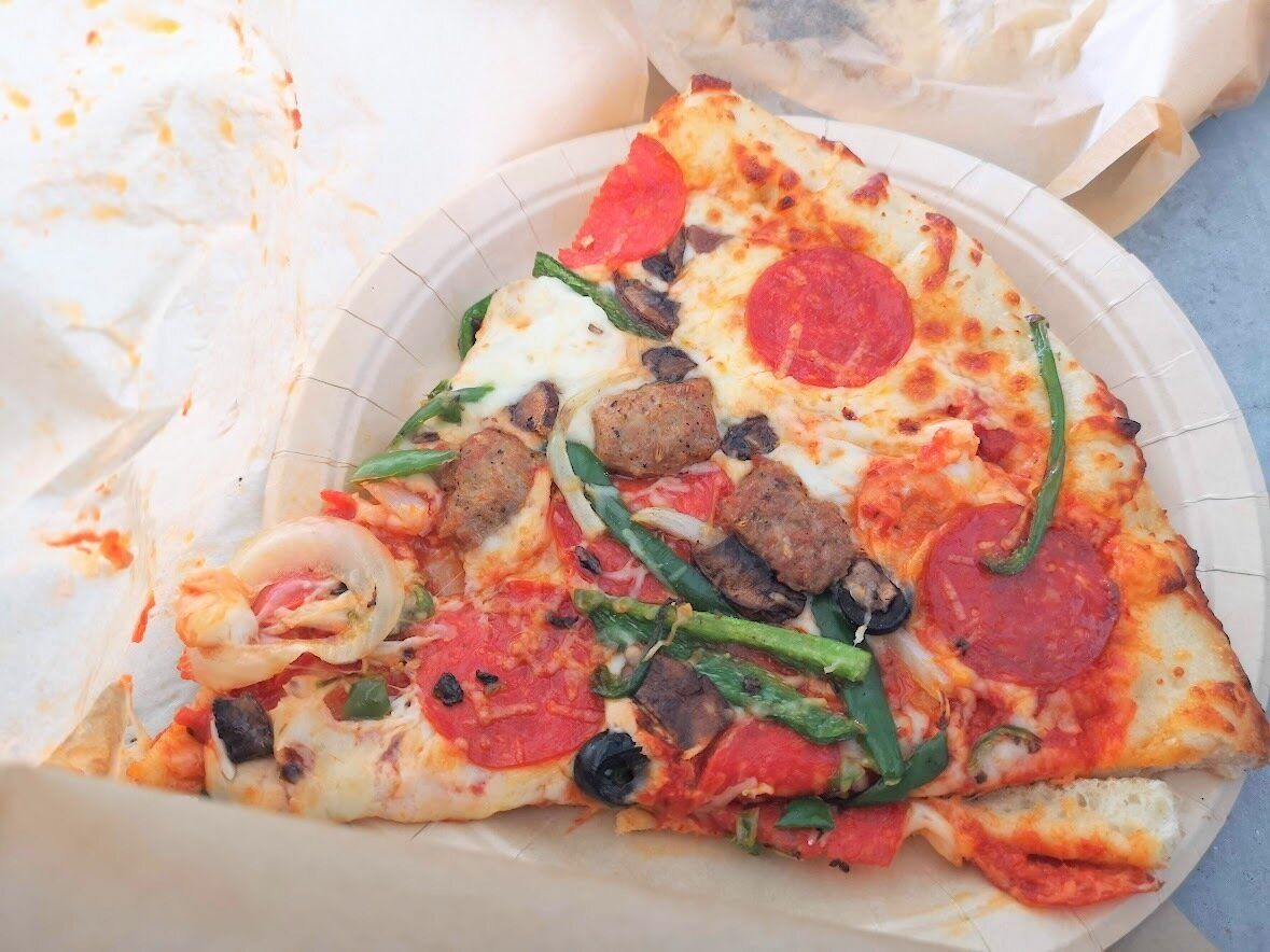 1番具だくさんなカットピザはこちら!コンボです。サラミ、玉ねぎ、ピーマン、オリーブ、ソーセージなどがたっぷりのっているので、ひとくちで色んな味が楽しめますね。