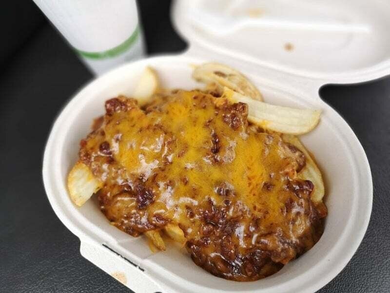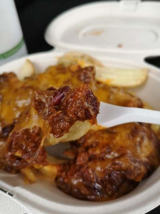 V字型のフライドポテトに、スパイシーなチリビーンズがドサッと乗っていて上にはとろりとチーズがのった