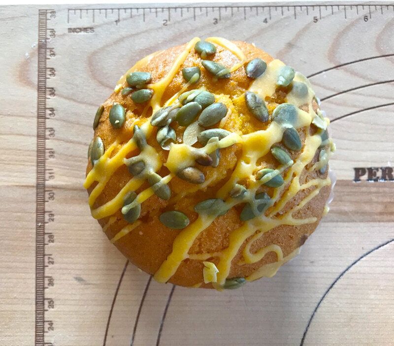 トップにパンプキンシードと黄色の甘いアイシングがトッピングされていて可愛らしい見た目ですね。