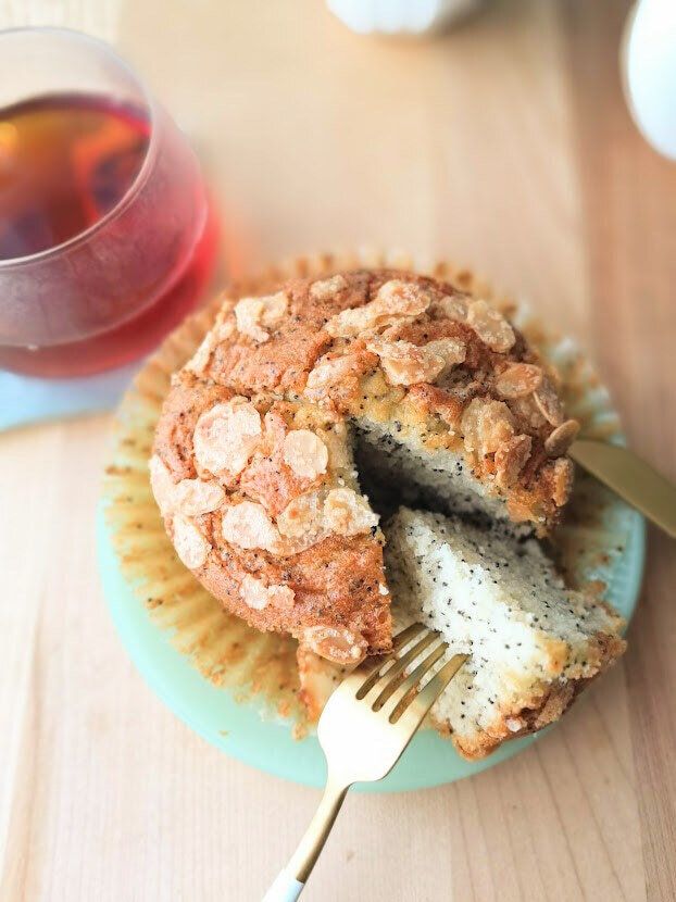 生地全体にポピーシードが混ぜられており、トップにはアーモンドスライス、その上から砂糖がまぶされて焼き上げられているので、アーモンドはきつね色に香ばしく、砂糖はカリッと仕上がっていて・・見るからにおいしそう!