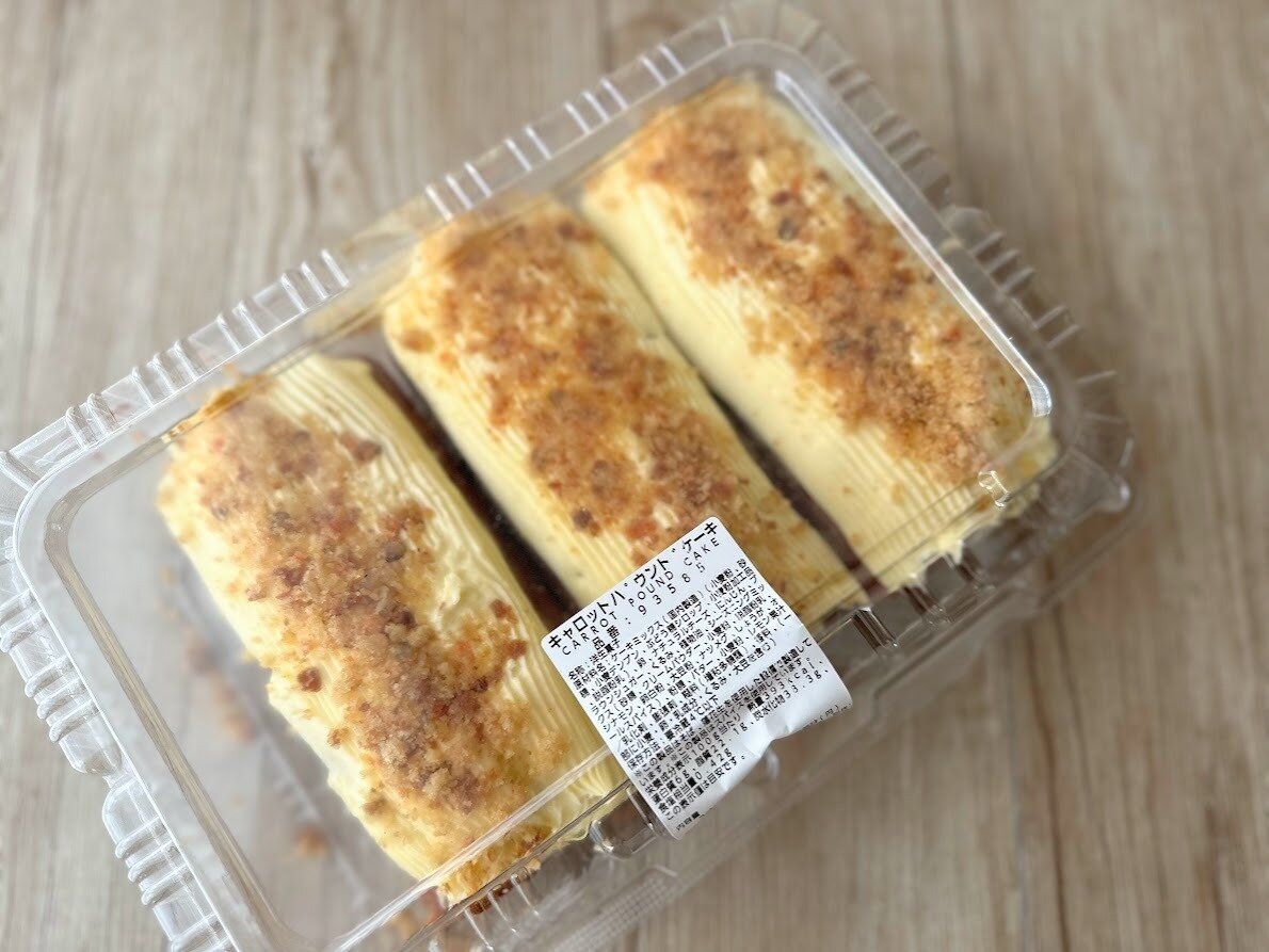 その名も「キャロットパウンドケーキ」大きなパウンドケーキが3本どっしりと並ぶ様子は、さすがコストコ!という迫力です。
