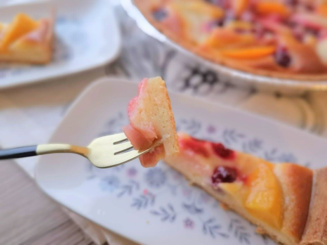 タルト生地にフィリングとフルーツをいれて、焼き上げられているタルトで、焼き菓子に近いような仕上がりです。