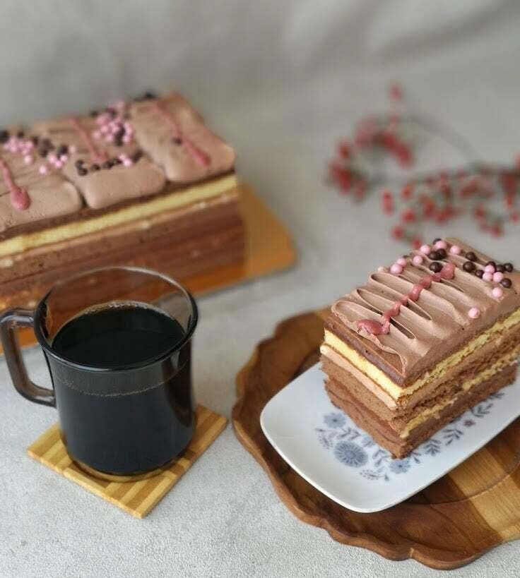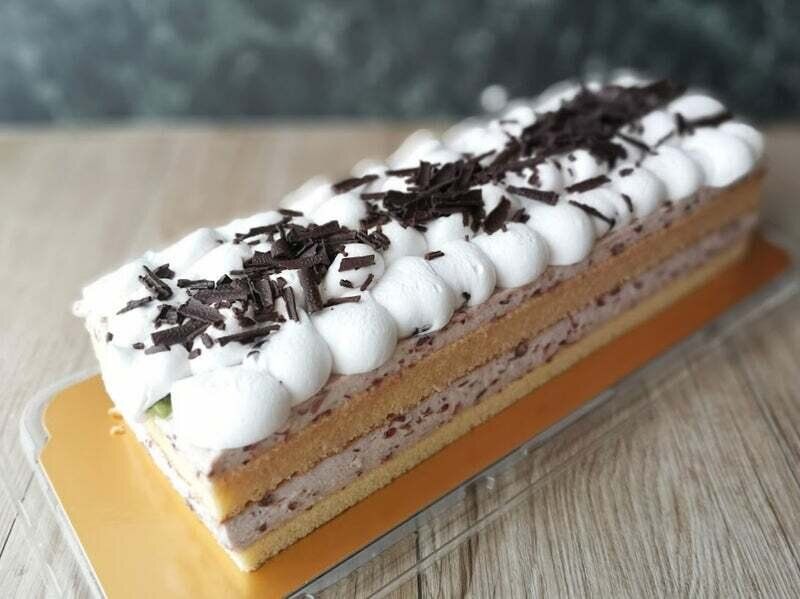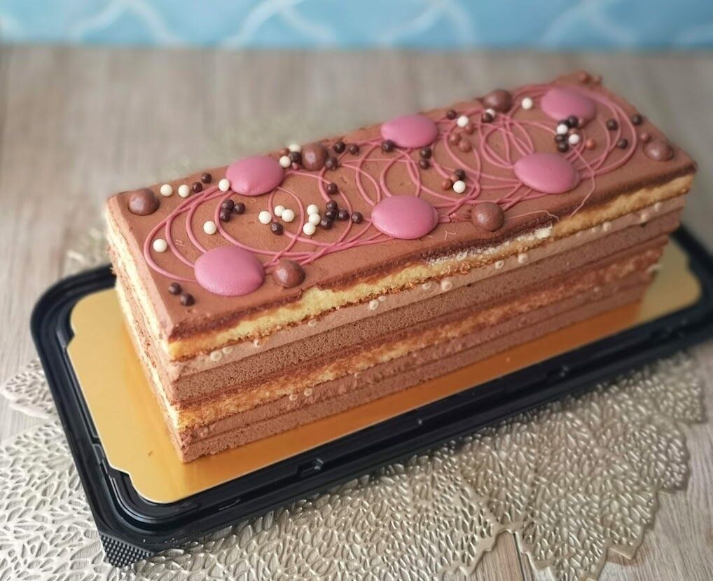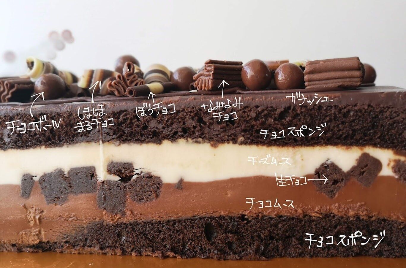 ガナッシュクリーム、スポンジ、チョコレートムース2種、チョコレートスポンジが、なんと8段にも重なったケーキ。大きさは、全長30cm、横幅10cm、高さ10cmとBIGサイズ