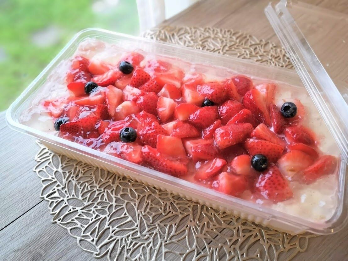 発売された時期が夏なので、トップには涼しげな透明ジュレがのせられていて、イチゴとブルーベリーが浮かんだようなデコレーションのスコップケーキ。