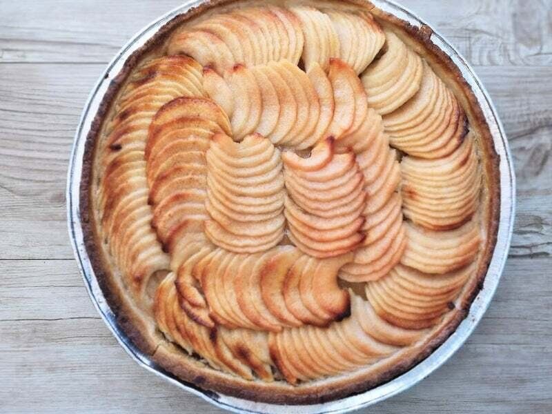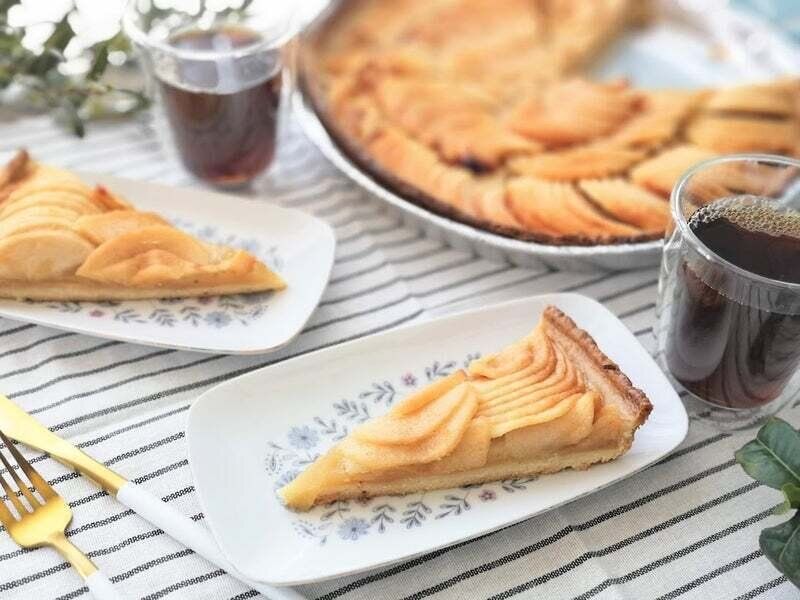 タルトの作りもとってもシンプルで、タルト地の上にりんごピューレが流されていて、その上にスライスしたリンゴが飾られて焼いてあるだけ!