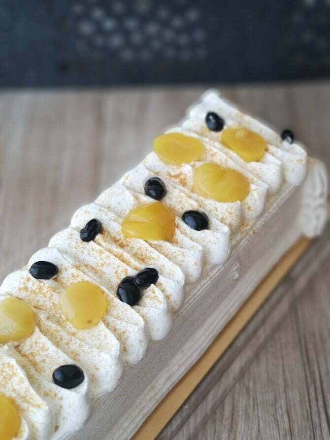 2月に発売された商品ですが、栗の甘露煮、黒豆と言った日本のお正月でおなじみの甘味がのったケーキ。