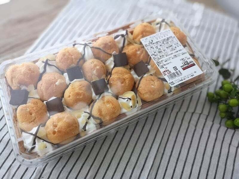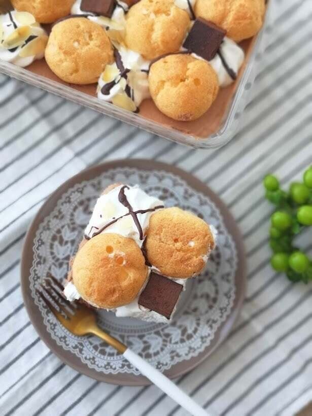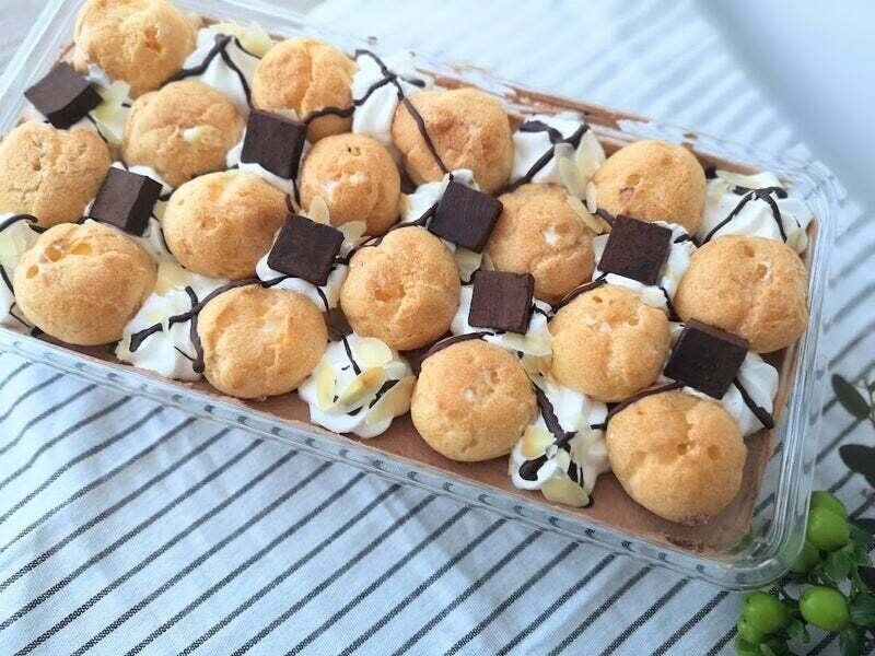 トップには、プチシューとホイップが交互に並べられて、チョコレートシロップと生チョコ、アーモンドスライスで飾られています。