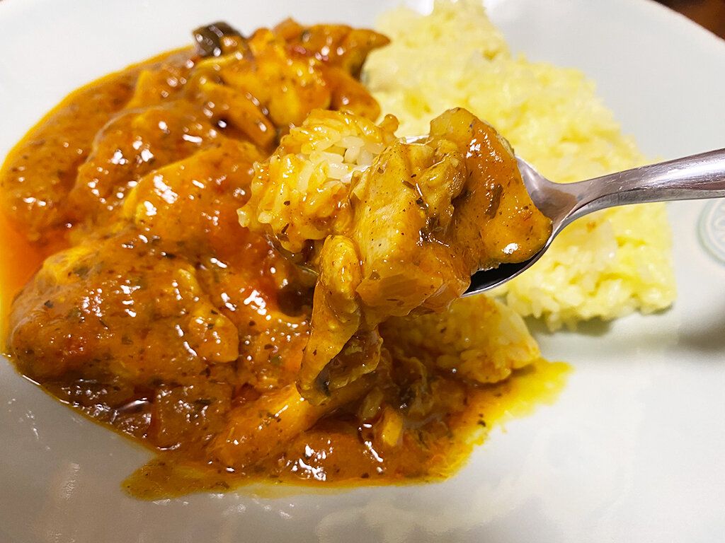 お肉や野菜を炒めて、上のスパイスを入れてソースを入れるだけ!約15分で本格的なカレーが作れました。