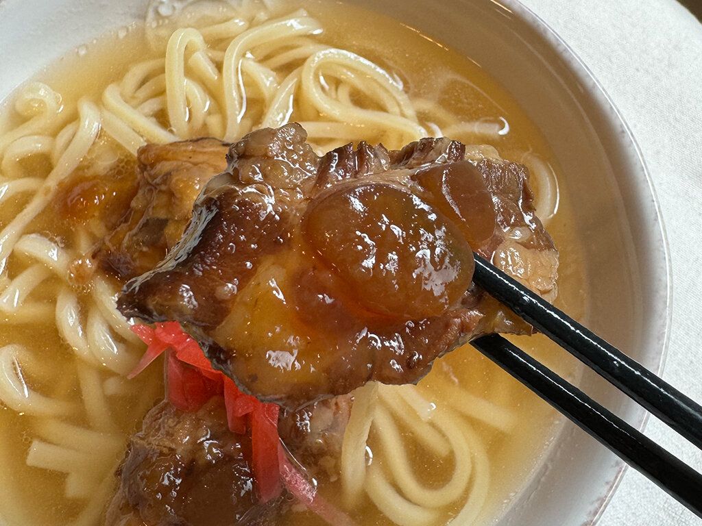 お箸を入れるだけで崩れるくらい柔らかいお肉。この軟骨のプルプル感は本場の味を思い出させるくらい本格的でした。紅生姜とコーレグースをかけたら満足の一杯が出来上がります。