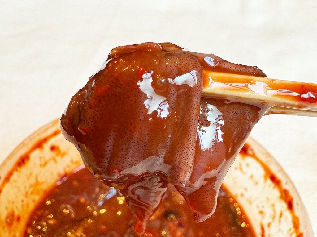 日本海産ほたるいかの醤油漬けを特製のヤンニョムに漬け込んだ逸品です。