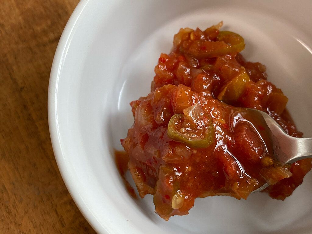 青唐辛子も一緒に漬け込んでいるので、ピリッと辛いのが特徴で