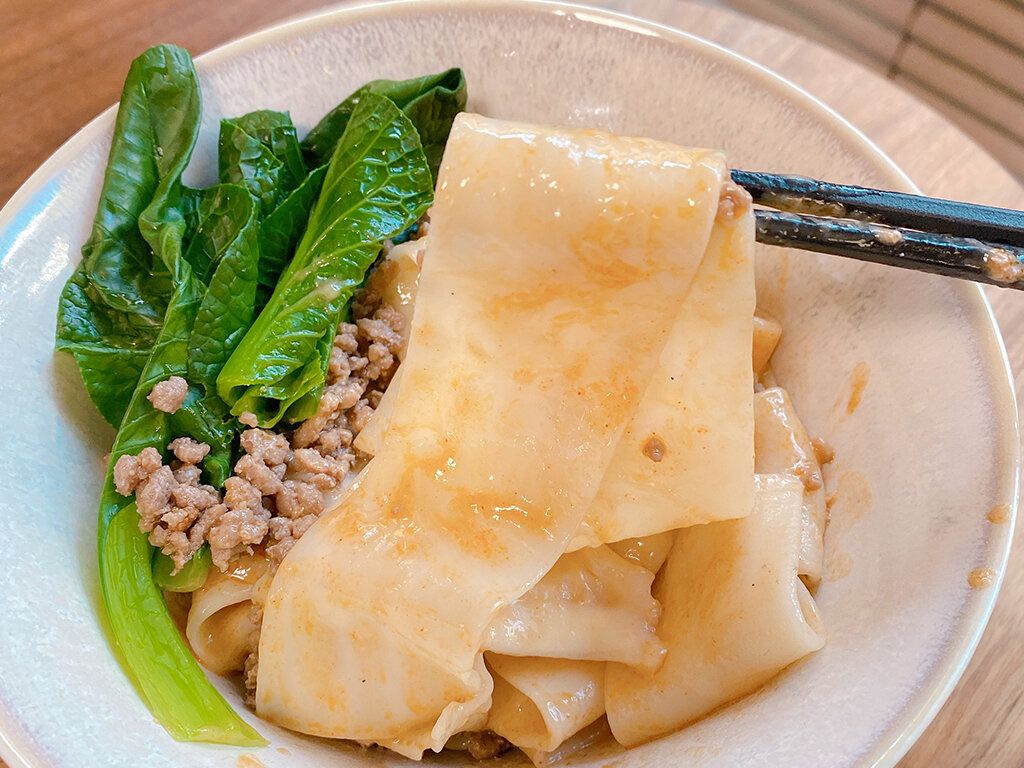 花椒のきいた麻辣のたれと絡めて食べる幅広麺。