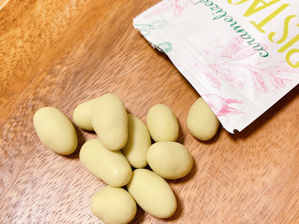イラン産ピスタチオをキャラメリゼして、ピスタチオが練り込まれてるチョコレートでコーティングされた商品。