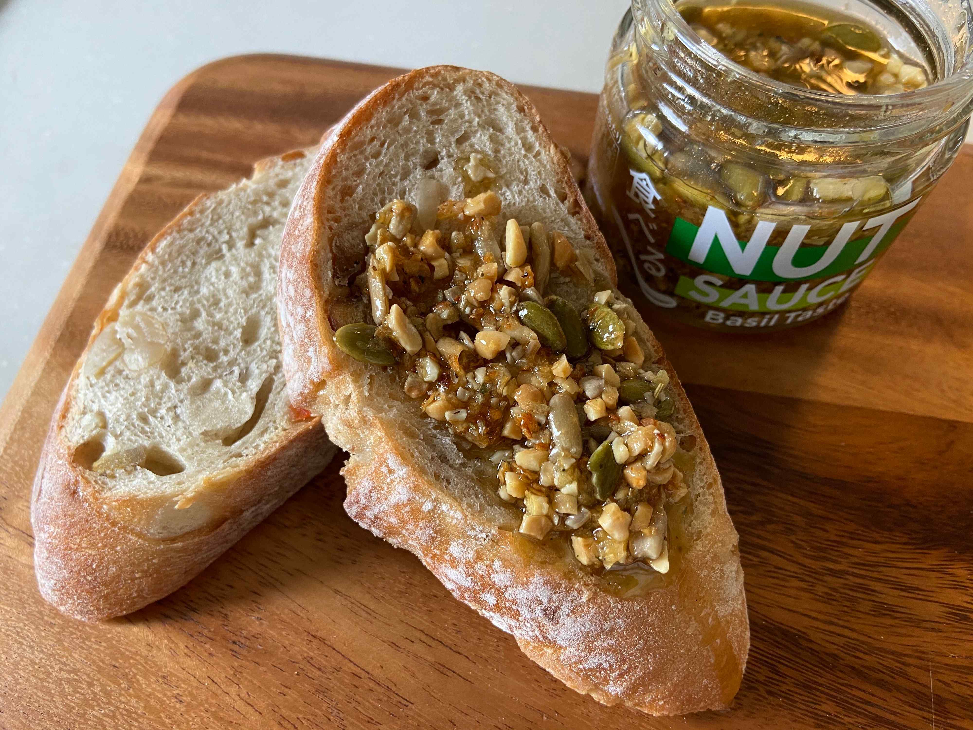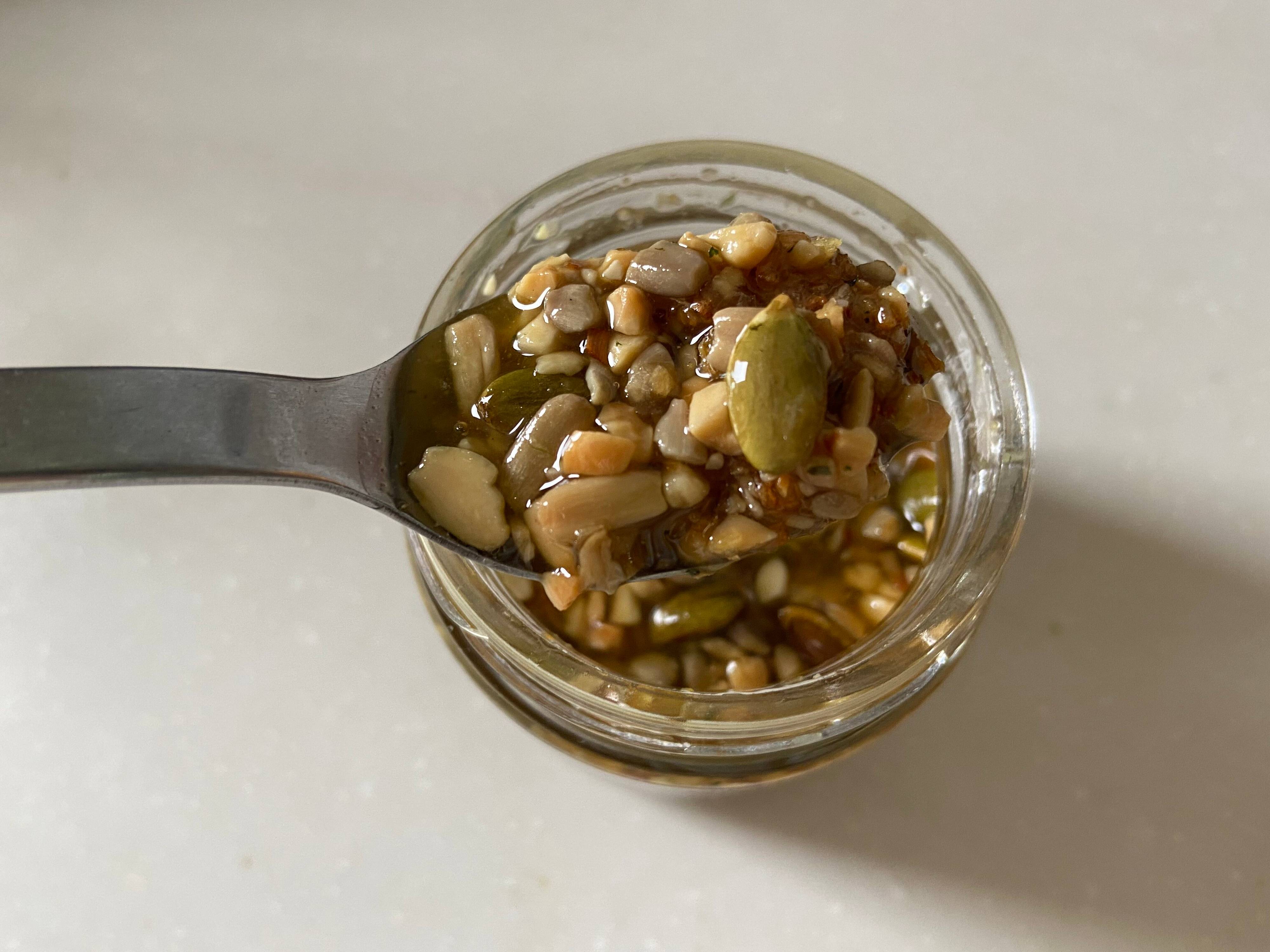ピーナッツ、ひまわりの種、かぼちゃの種、玉ねぎ、にんにくなどがたっぷり入ったバジル風味のオイルソースで、びんのふたを開けた瞬間から、いい香りが漂ってきます。