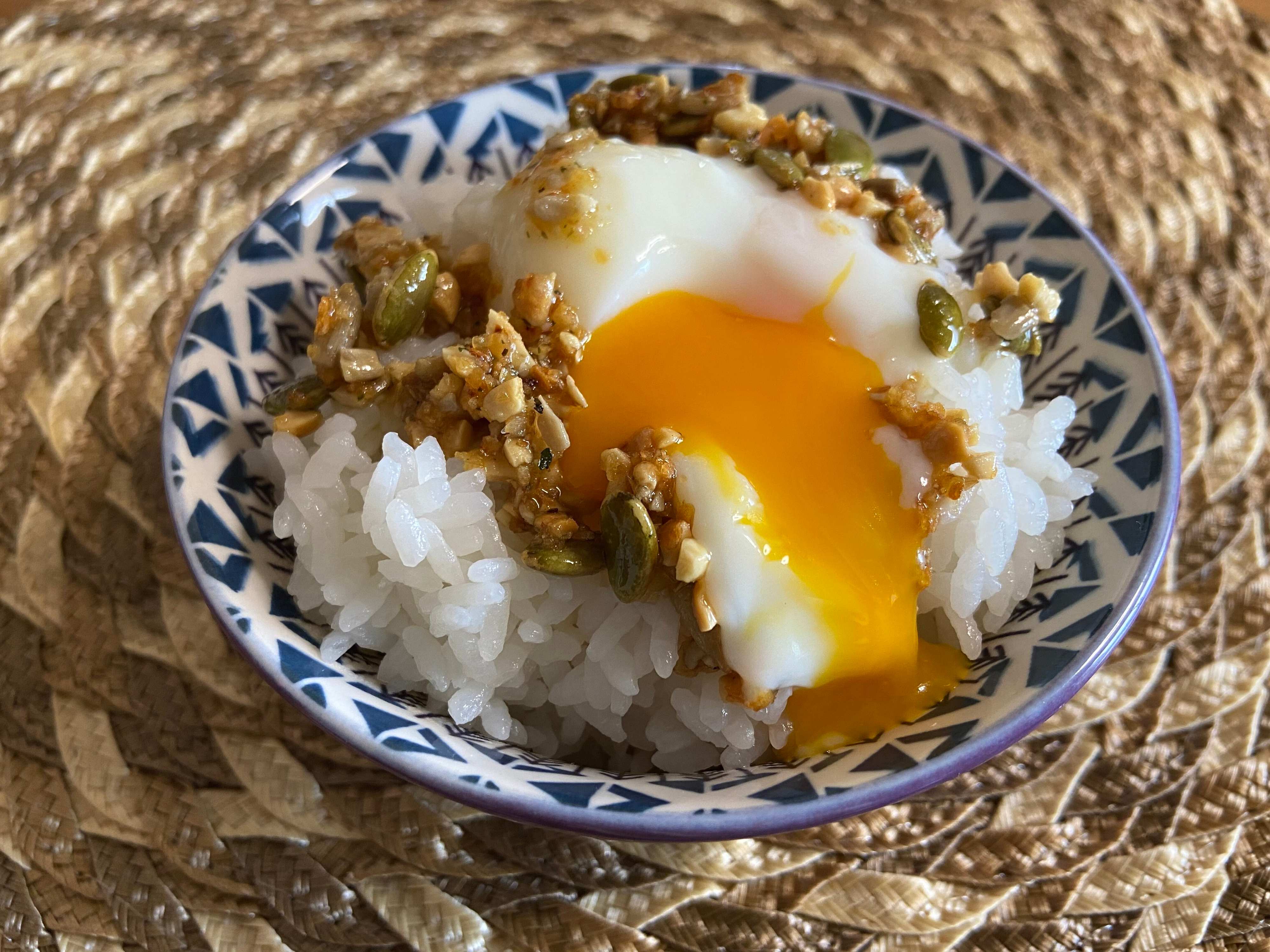 ご飯に温泉卵、食べるナッツソースをかけていただくと今までにない新感覚の卵かけご飯になり、とてもおいしいですよ。