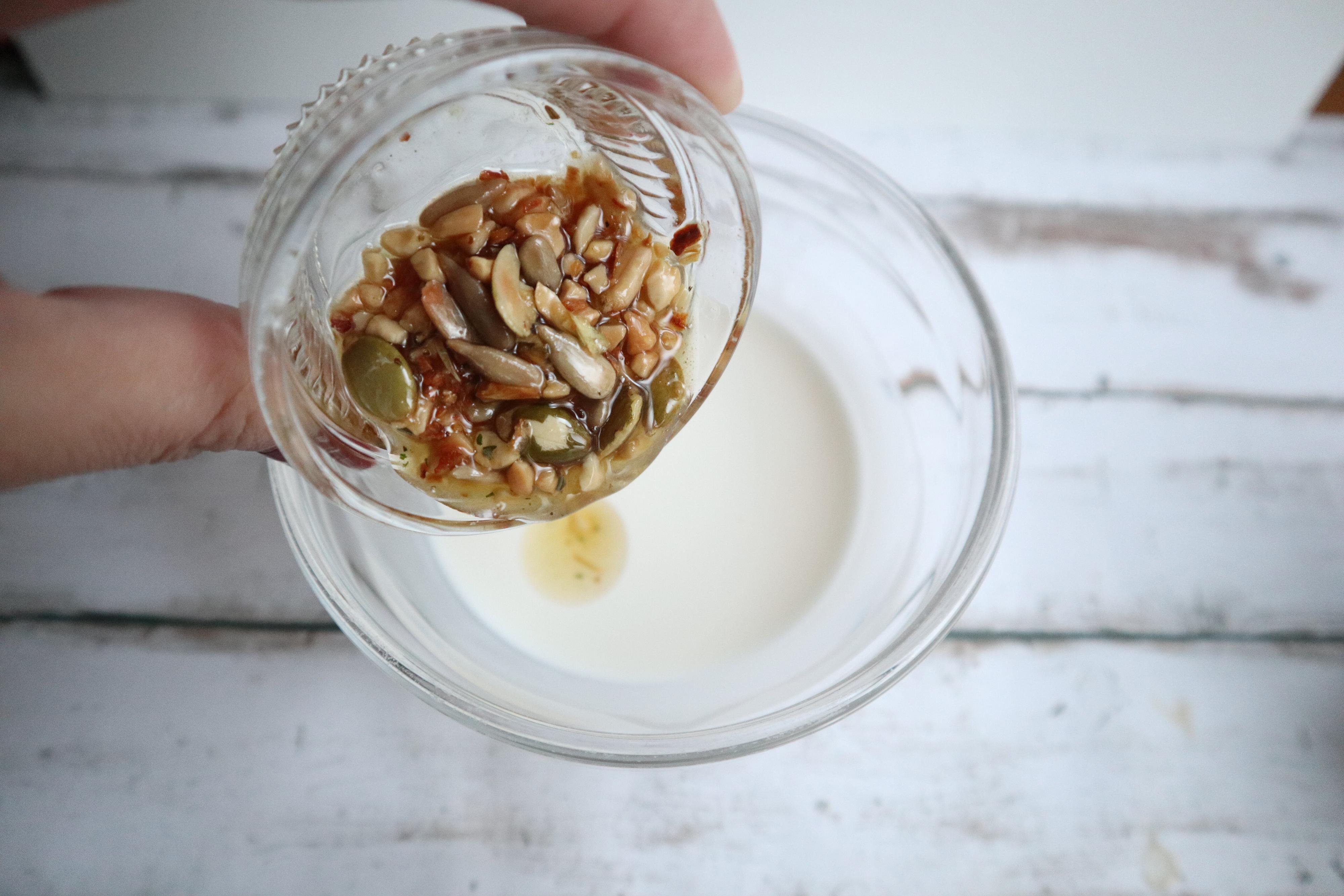 オイルの中にピーナッツ、ヒマワリの種、玉ねぎ、かぼちゃの種、ニンニクが入っておりザクザクとした食感と旨みがあります。さらに、バジル、ローズマリー、オレガノ、セージ、タイム、ナツメグなどスパイスやハーブも効いておりさわやかさとアクセントのある調味料です。
