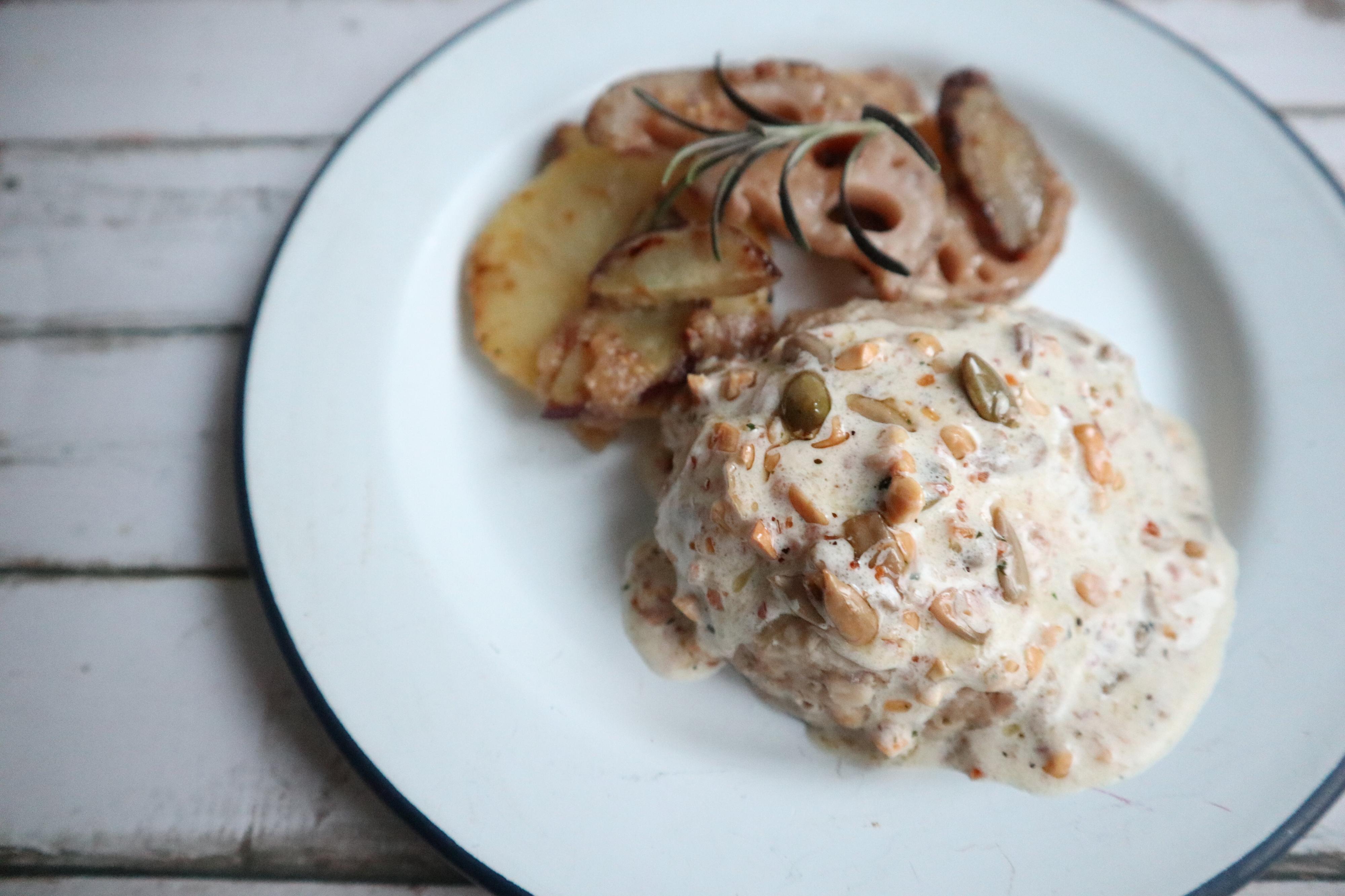 ハンバーグのソースに!クリーミーだけどナッツの香ばしさやスパイスが隠し味のように感じられて複雑な味わいのソースに。いつもの一品がちょっとグレードUPします。ハンバーグ以外にもチキンステーキや魚のムニエル、フライドポテトのソースにもおすすめです。