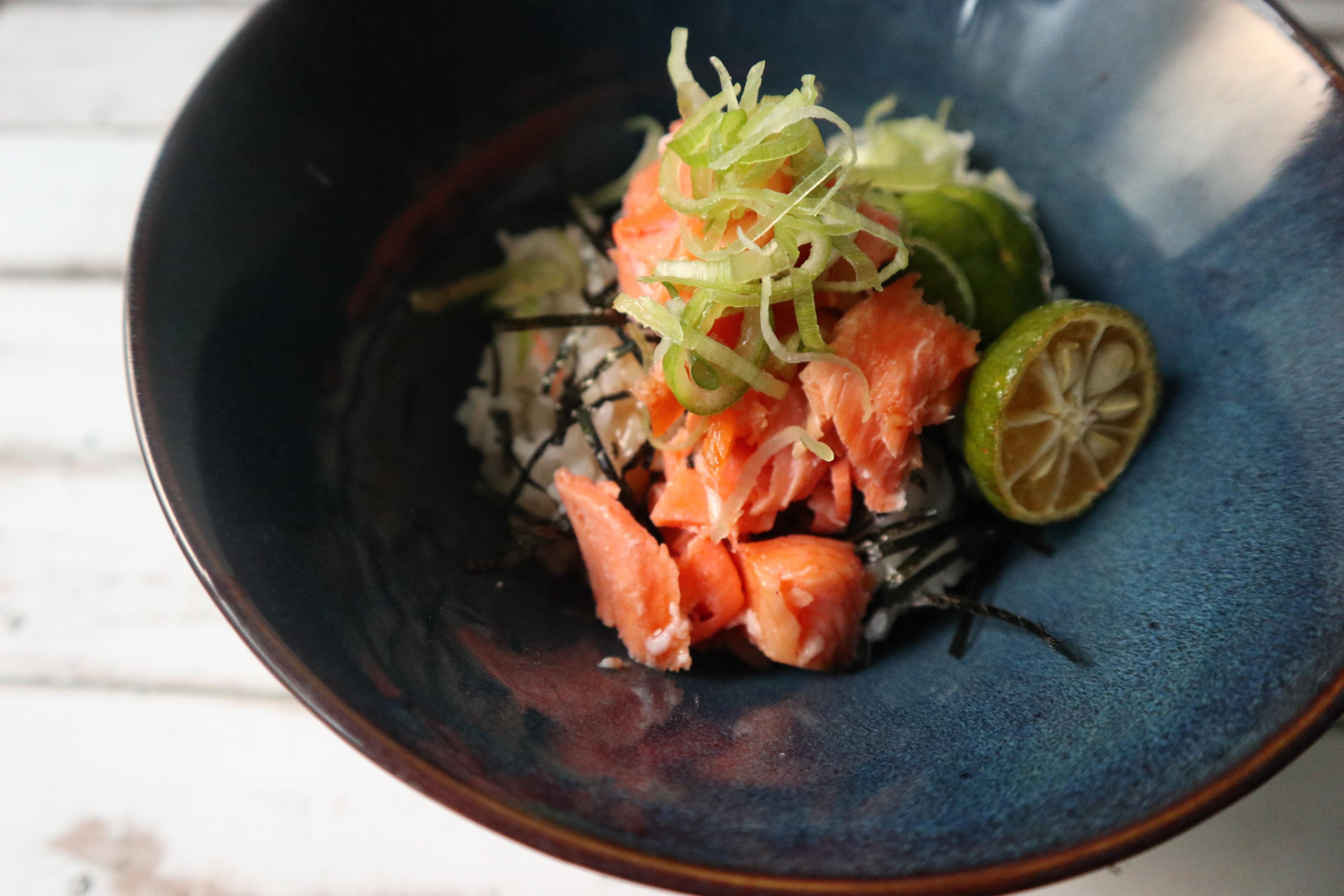 素をかけただけでは味気ないので、海苔、焼き鮭、ねぎをトッピングしました。なんちゃって親子丼です。相性のいい海苔と鮭が加わるだけで満足感もアップします!
