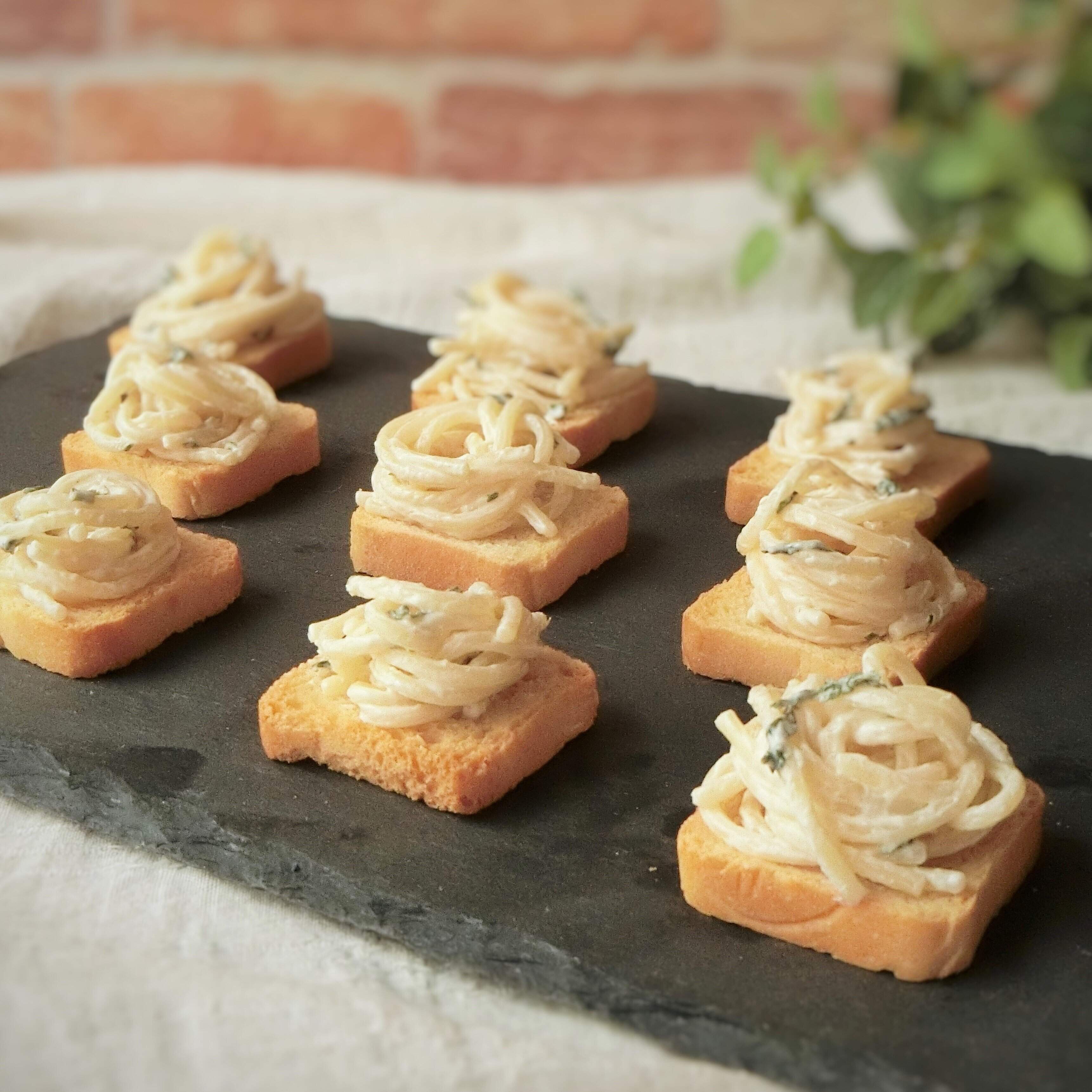 ゆでたスパゲッティにクリームチーズと塩こしょう、バジルなどを混ぜ合わせてクラッカーに乗せるとカナッペになります。少量のスパゲッティで一口サイズのおつまみがたくさんつくれます。