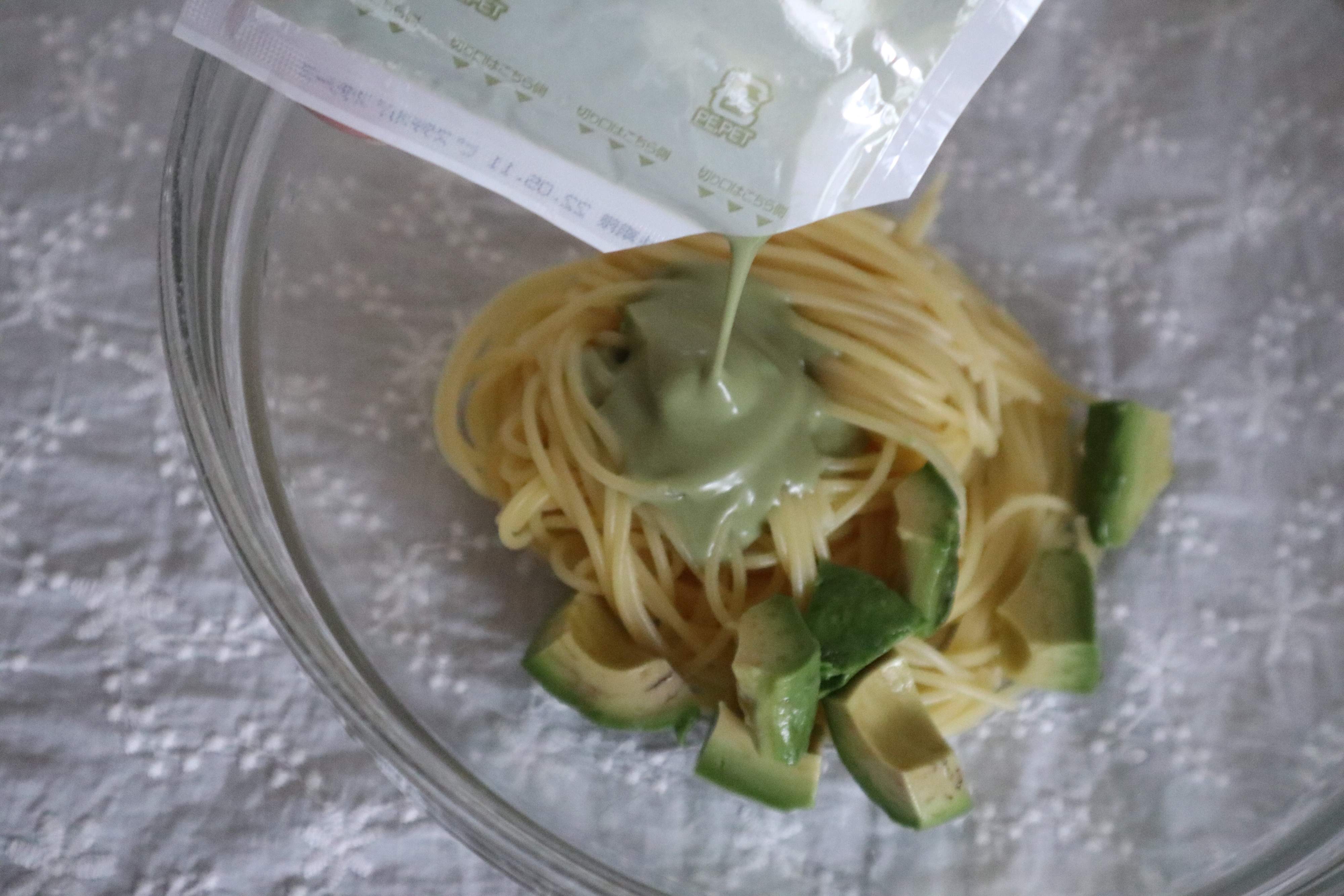 ゆでたパスタ(1人前)と和えるだけで簡単にクリームパスタができます。私は角切りにしたアボカド(1/2個)も加えています。