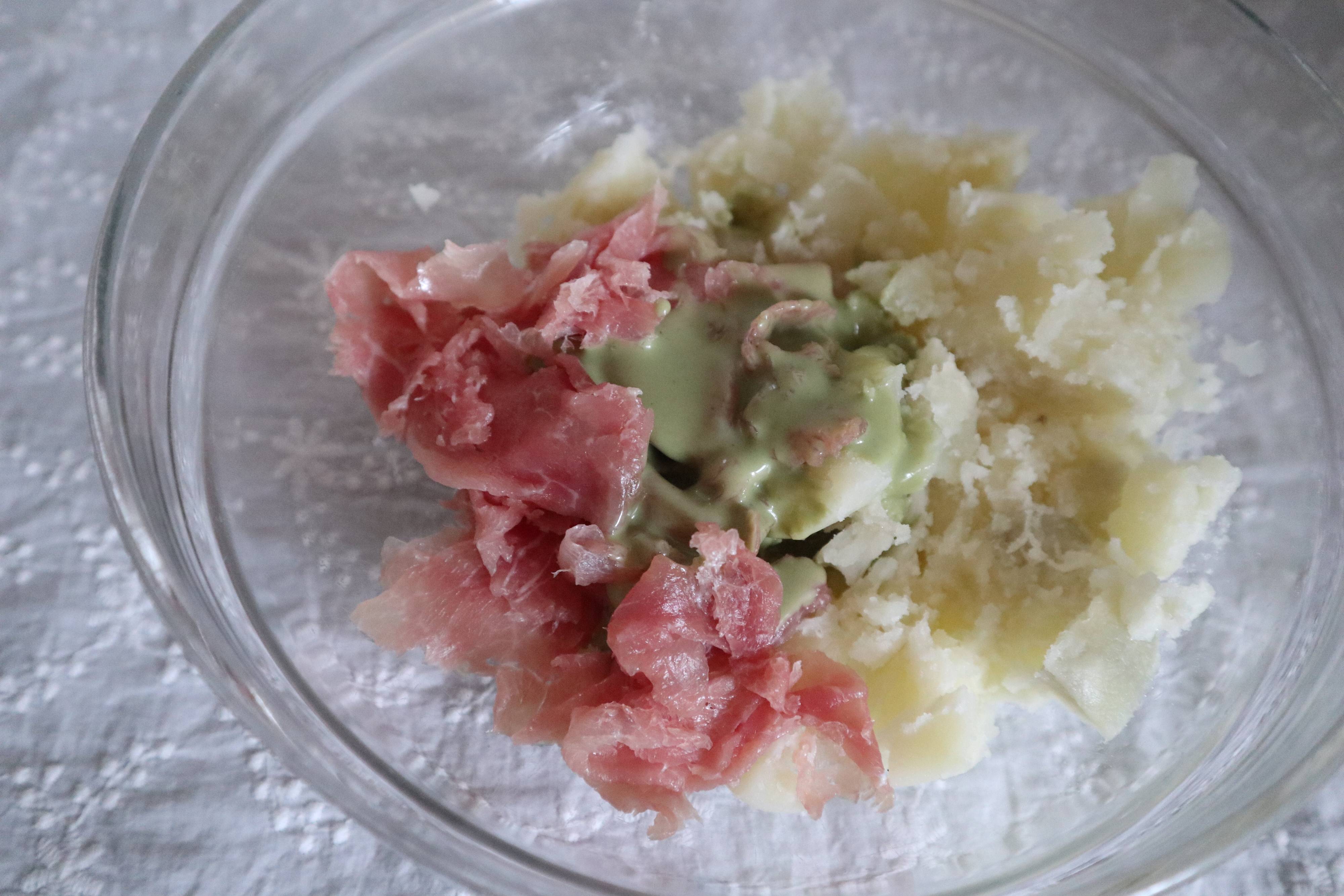 1.じゃが芋はひと口大に切り耐熱ボウルに入れて、ふわっとラップをして600Wで6分加熱してフォークで軽くつぶす。