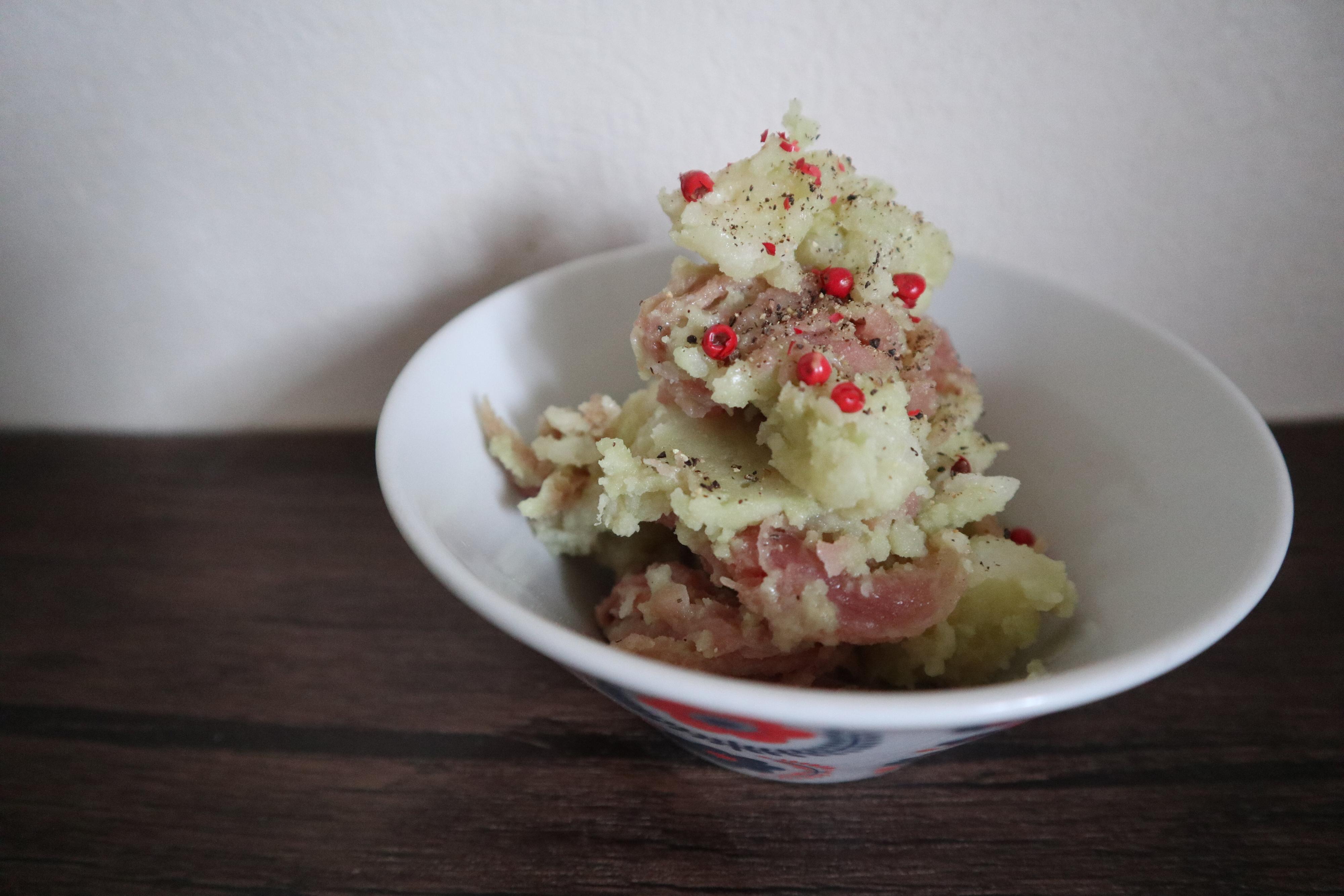 ポテトサラダを盛りつけ、ブラックペッパーとあればピンクペッパーをちらして「ピスタチオポテトサラダ」の完成。