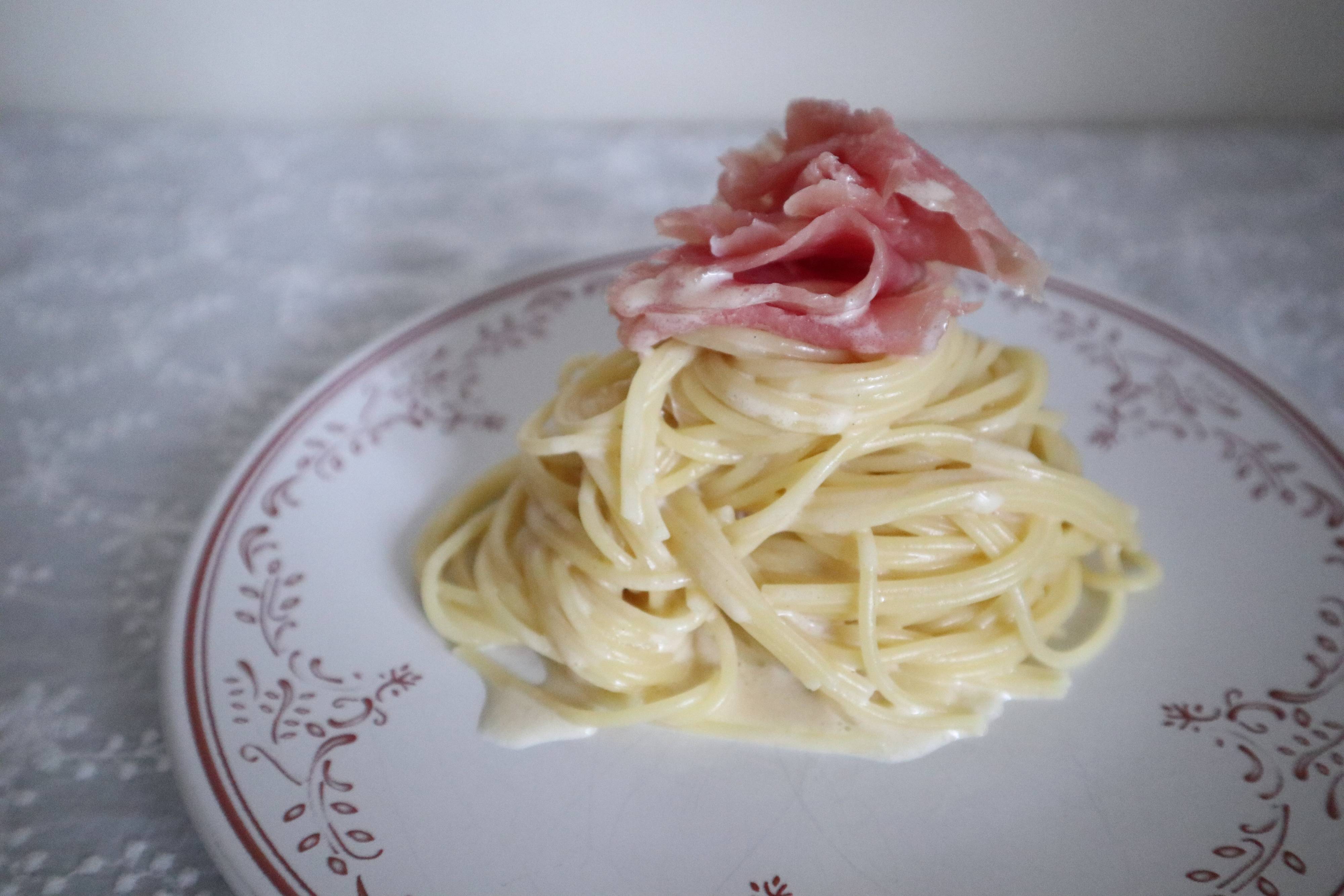 パスタを器に盛り、生ハムをトッピングしました。クリーミーなソースがパスタによく絡みます。