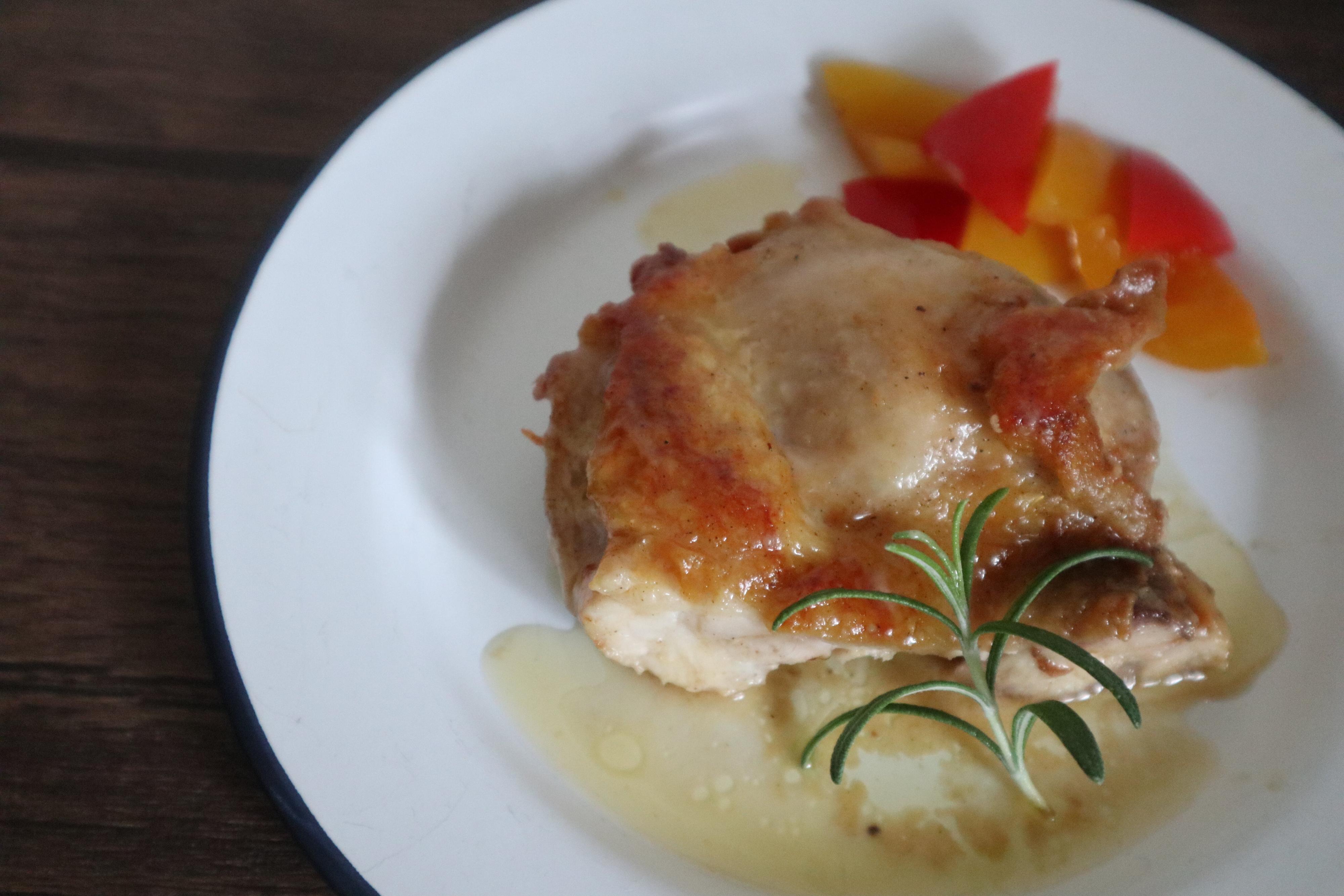 1.鶏モモ肉の両面に塩、ブラックペッパーをふるう。中火にかけたフライパンで鶏モモ肉をのせて両面こんがり焼く。