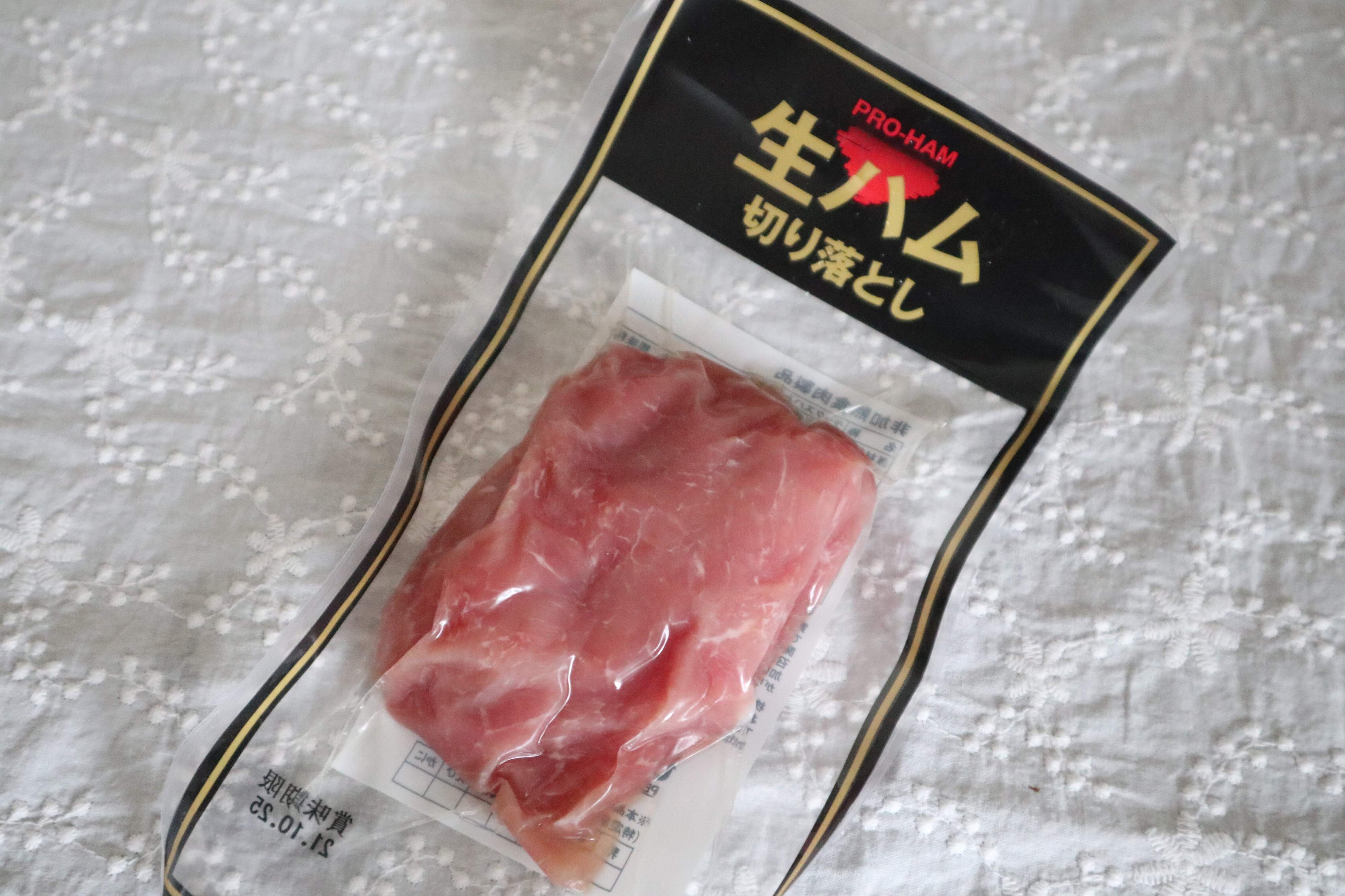 ちなみに生ハムはカルディの鬼リピ商品、生ハム切り落とし(120g/338円)を使っています。カルディに行くとついつい買ってしまうものの一つです。