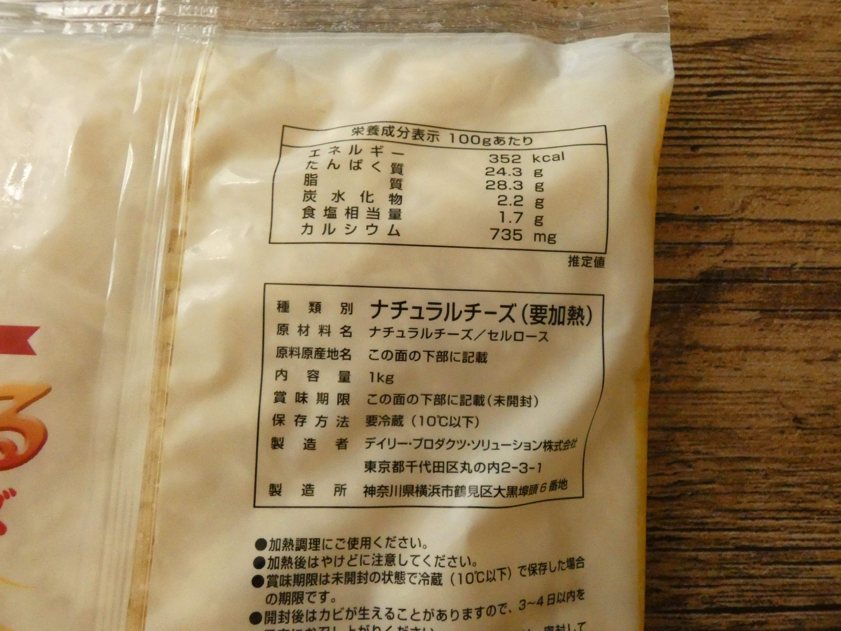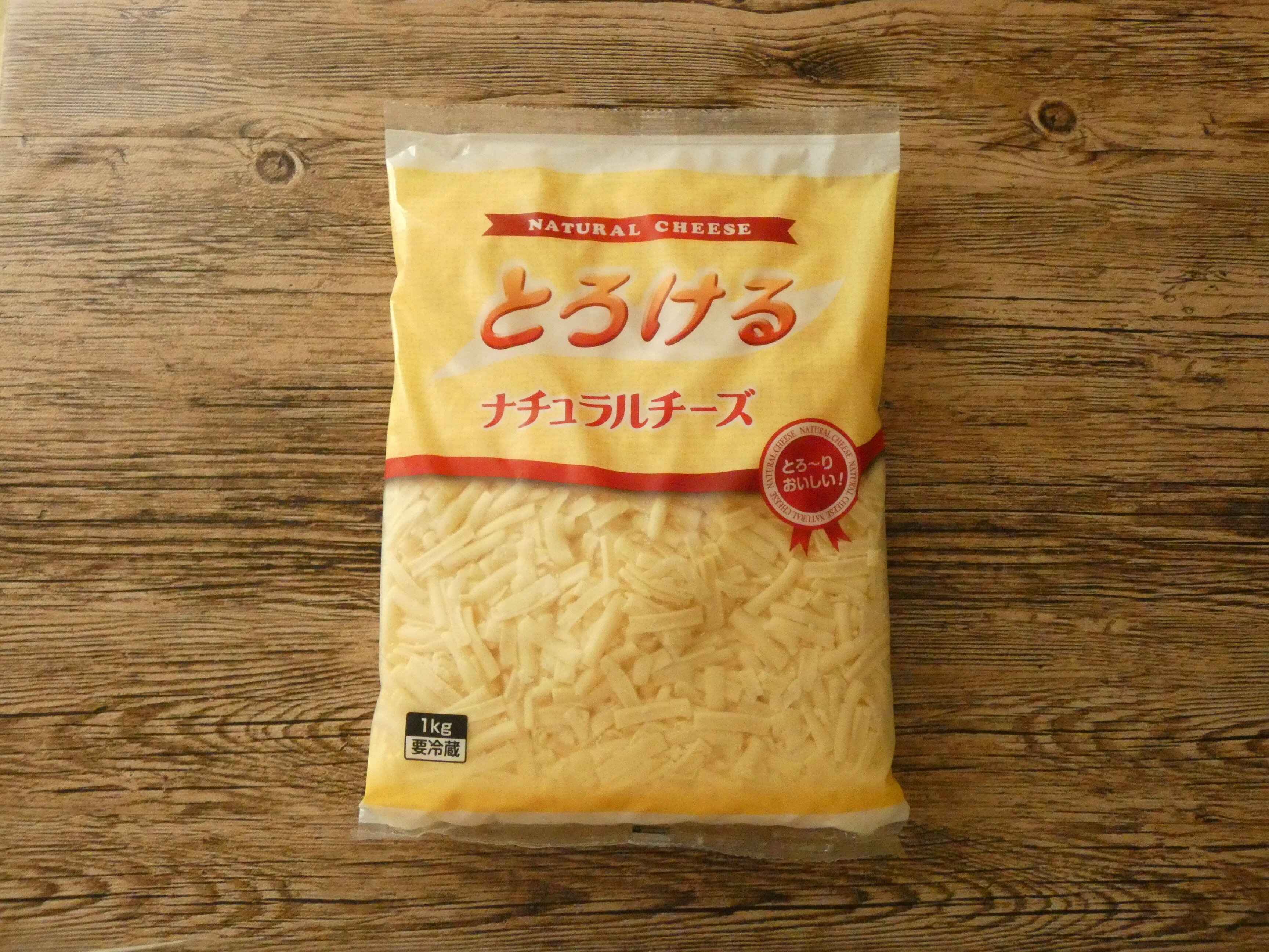 業務スーパーのとろけるナチュラルチーズは1kg732円。シュレッドチーズがたっぷり入って100g100円以下!!これはコスパバッチリです。