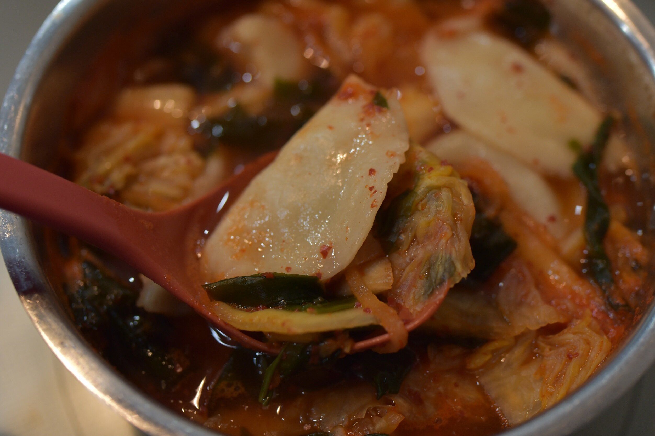 餃子のモチモチ食感が気に入ったので、スープ餃子にもしてみました。今回は、たっぷりのキムチとわかめを入れたスープです。