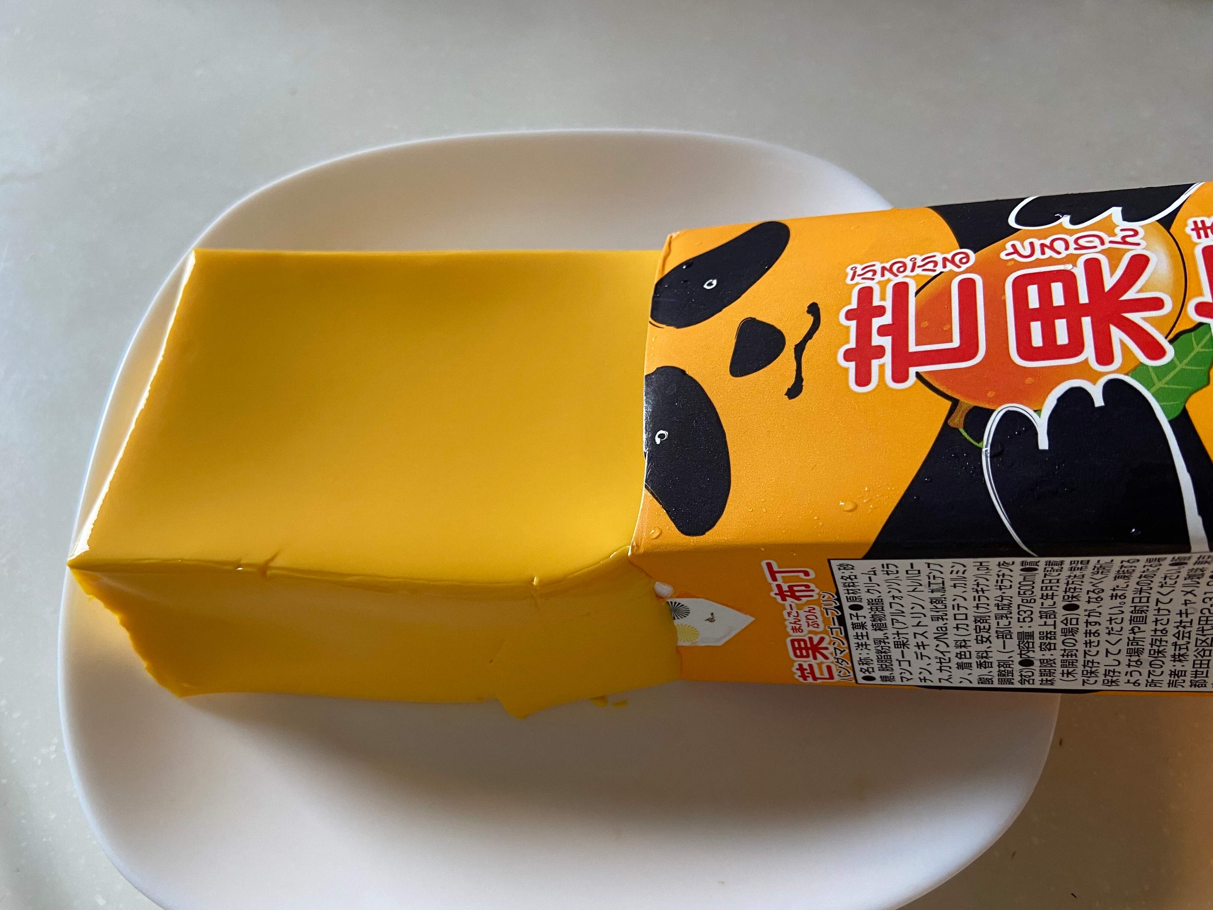 パック上部をハサミでカットして揺らすと、つるんとマンゴープリンが登場!この取りだす工程もまた面白くて、子どもたちと一緒に毎回の楽しみになっています。