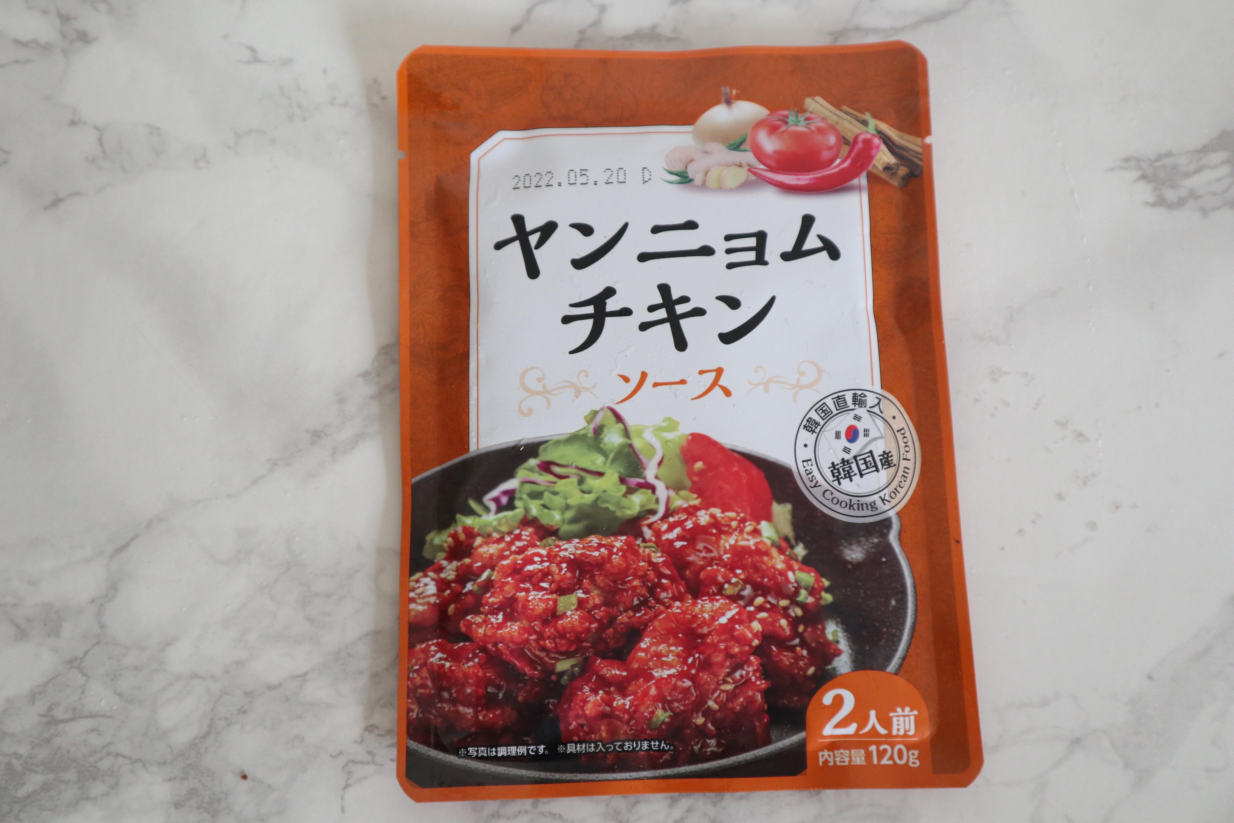 「ヤンニョムチキンソース」は2人前120gで、価格108円。韓国直輸入のソースです。韓国風唐揚げが手軽につくれます。