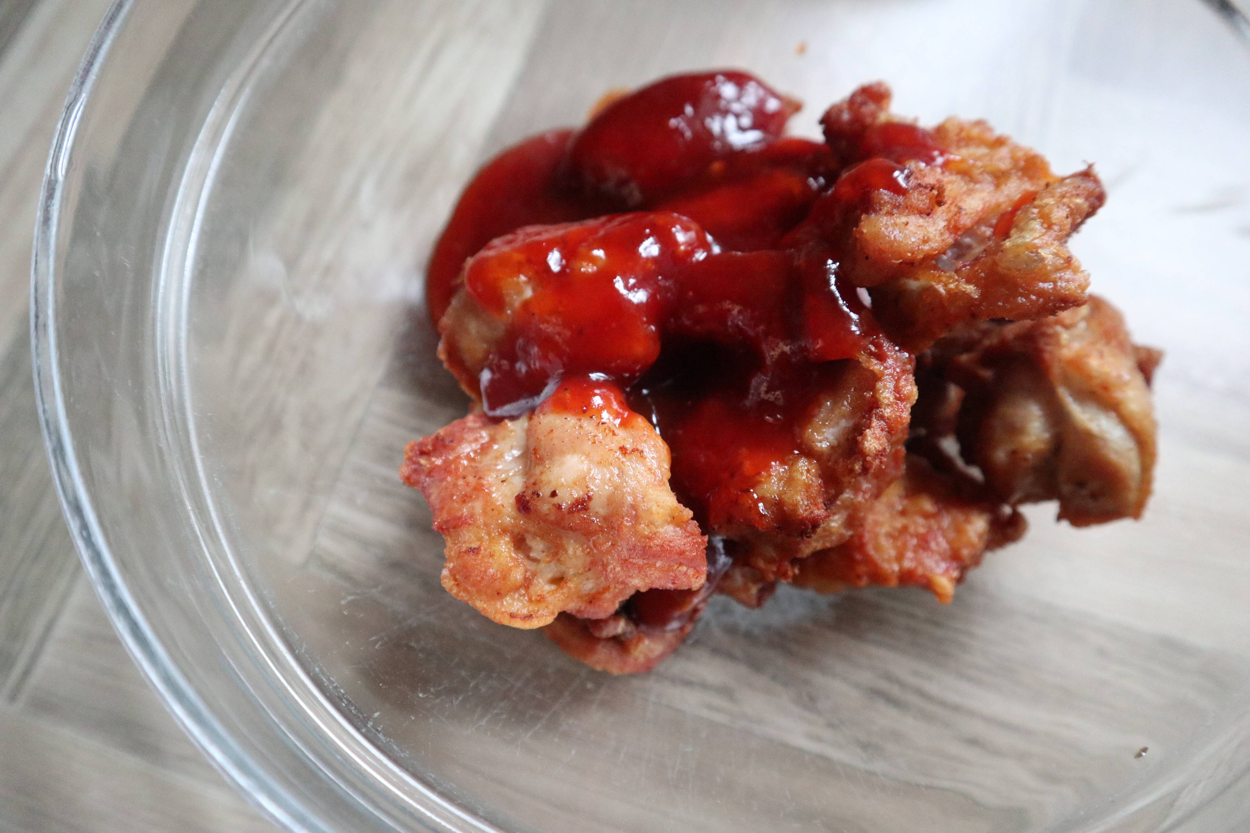 ボウルに唐揚げ300gを入れて、ヤンニョムチキンソース1袋をかけてからめます。