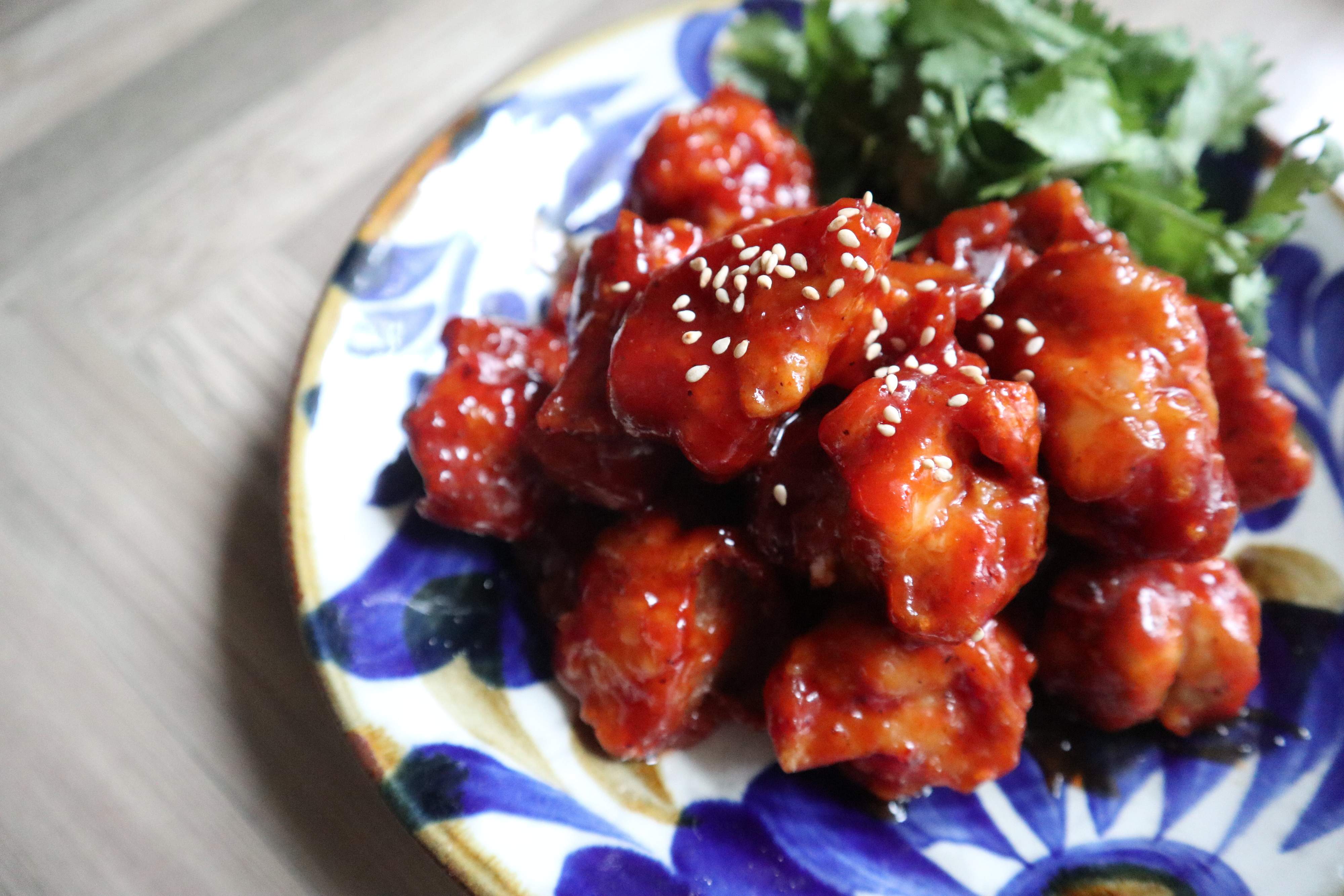器に盛って、ごまをふったらヤンニョムチキンの完成です。お好みでパクチーを添えるのもおすすめです。