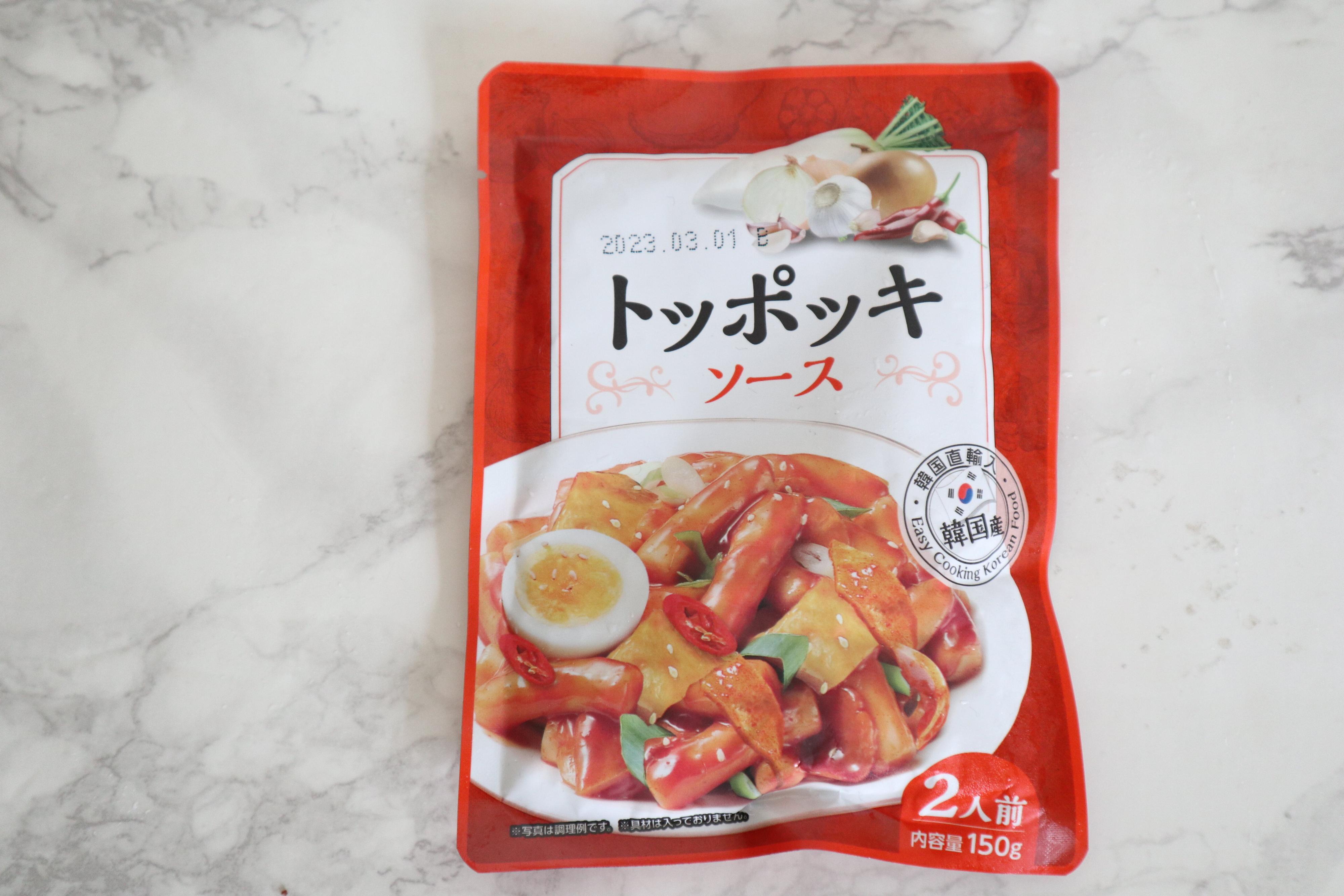 「トッポキソース」は2人前150gで、価格108円。こちらも韓国直輸入のソースです。今回はこちらの商品を使って、いまSNSで話題のライスペーパートッポギをつくってみます。